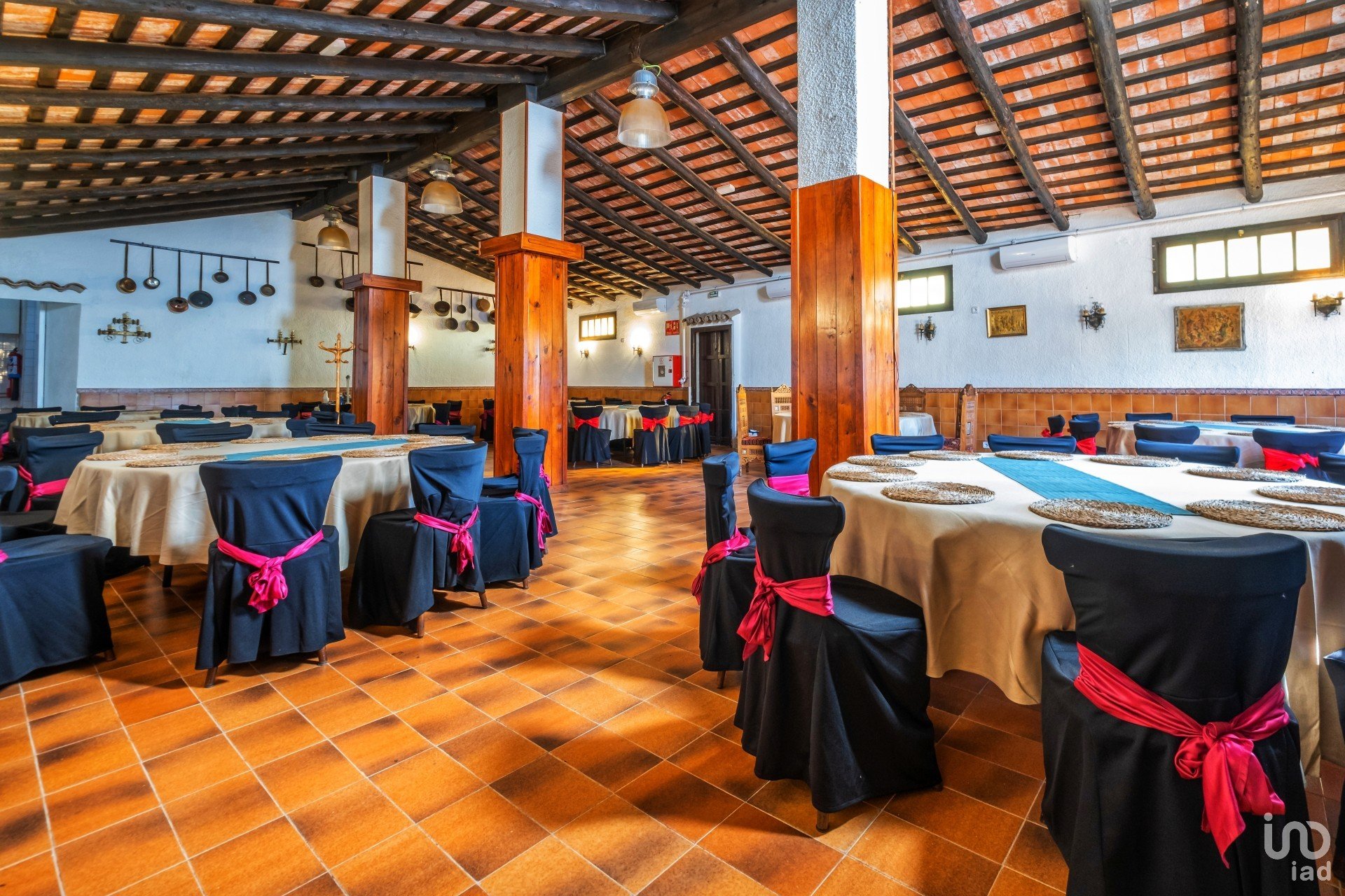 La planta principal contiene un gran recibidor/zona de recepción, despacho, zona de barra (bar), tres salones comedores para 130, 30 y 15 comensales, gran cocina profesional totalmente equipada con cámara de frío. En la parte lateral derecha hay 3 baños, un almacén y una zona de porche con acceso directo al jardín y piscina. En el lado izquierdo del edificio, un apartamento independiente del resto del edificio con salón-comedor, cocina americana (tipo office), un dormitorio doble y un baño completo con ducha.