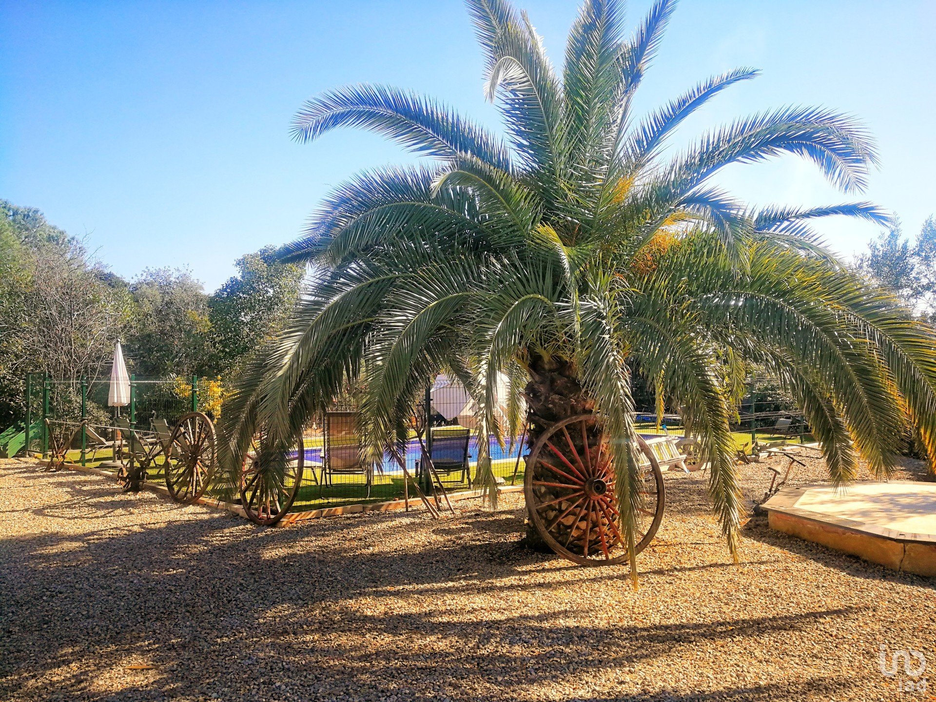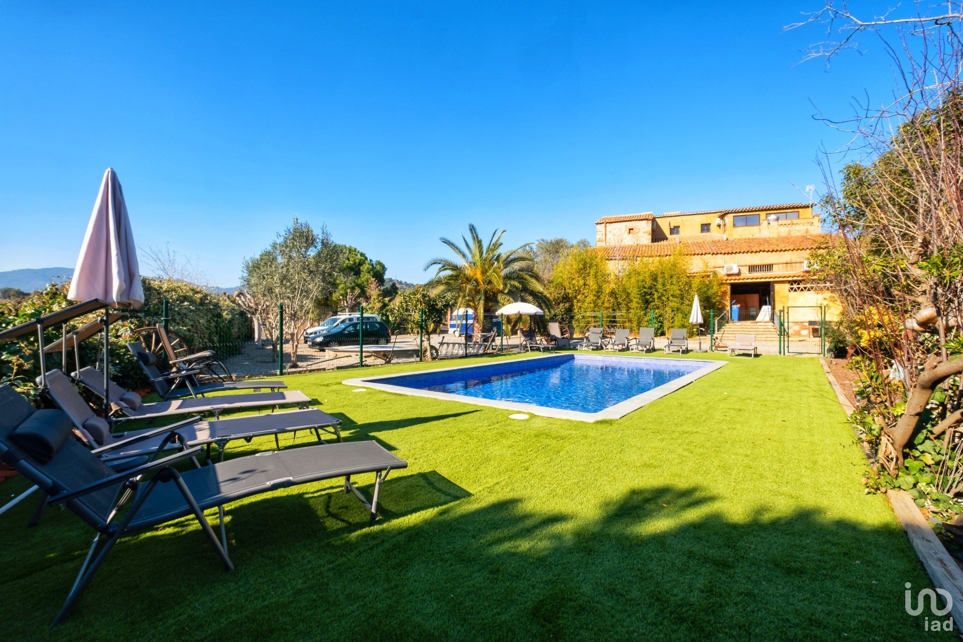 En la entrada a pie de calle hay un gran porche - terraza con una zona cubierta. Desde allí podemos acceder a otras zonas alrededor de la propiedad (finca de 4.325m2) - terrazas, jardines, parking, huerto, piscina con zona de descanso y diferentes espacios adaptables para eventos. El terreno es urbanizable - tiene potencial edificable, siendo apto para construir, por ejemplo, casas de madera.