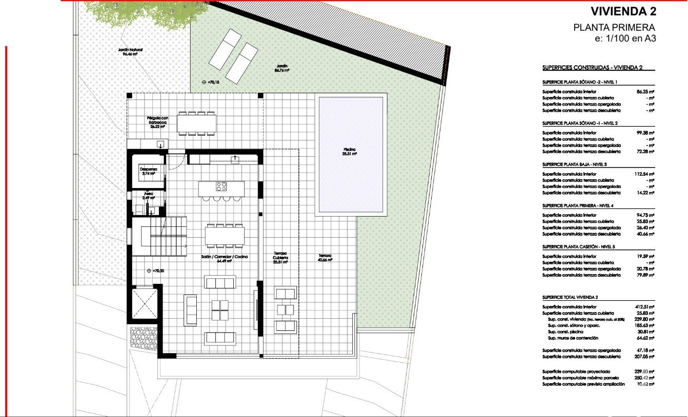 El interior se caracteriza por sus espacios luminosos y modernos, mientras que en el exterior destaca una piscina privada rodeada de jardín, ideal para el ocio y el descanso. La propiedad incluye un amplio garaje con capacidad para hasta tres vehículos, así como un trastero independiente.