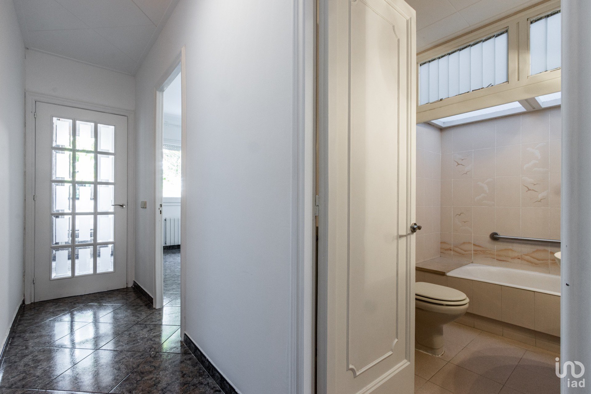 Nada más entrar a la finca, encontraremos un recibidor en forma de pasillo al estilo inglés, el cual recorre todas las estancias de la vivienda. Avanzando por el pasillo, encontraremos a mano izquierda la primera habitación doble, muy luminosa, con luz natural y de grandes dimensiones. A continuación, tenemos el baño, amueblado, con bañera y bidé. Dispone también de luz natural gracias a una ventana superior a modo de lucernario, que además ilumina otras estancias de la casa. Acto seguido, llegamos a la segunda habitación, esta individual, pero de dimensiones bastante generosas, donde también dispondremos de luz natural del anteriormente mencionado lucernario.