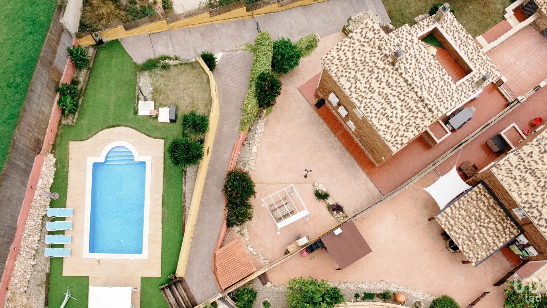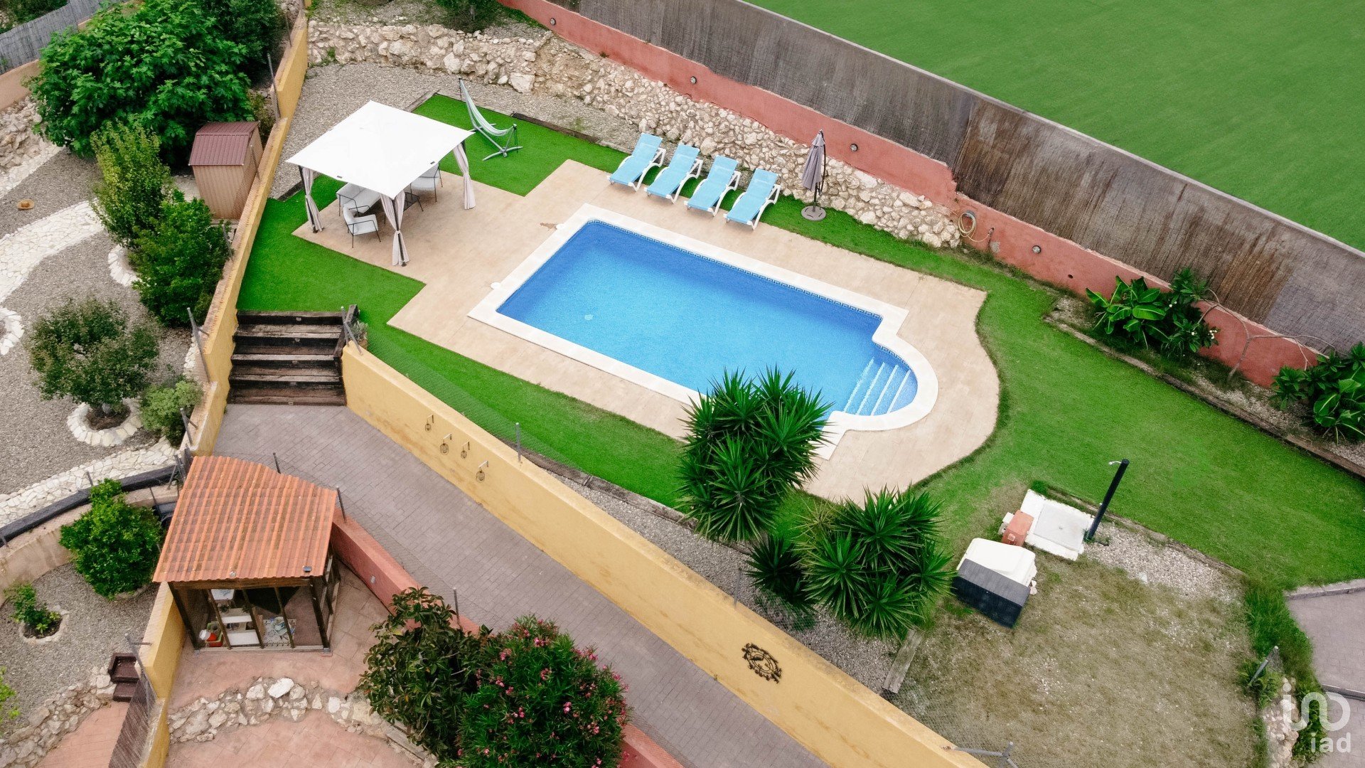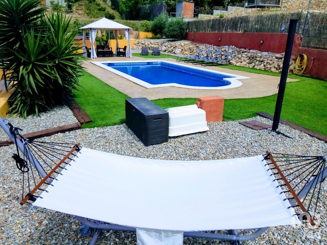 La piscina está vallada para mayor seguridad infantil, y el área exterior cuenta con iluminación automática, toldo en la zona de comedor y césped renovado este año.