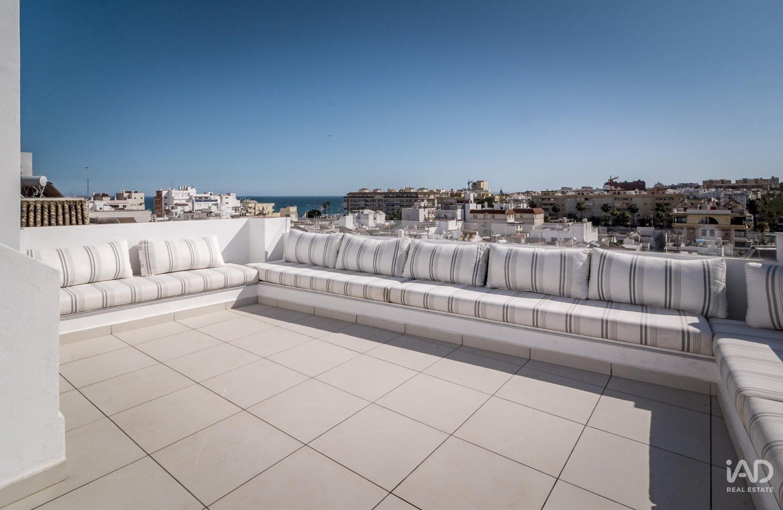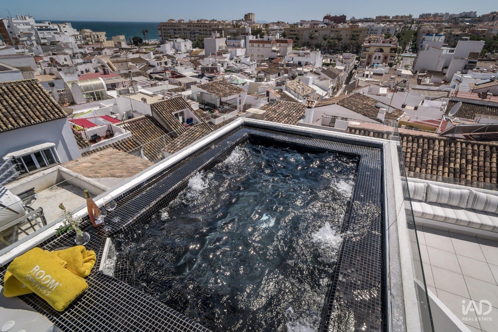 Exclusiva terraza con zona de bar, baño adicional y acceso a la azotea superior, donde se encuentra el jacuzzi y área de solárium con vistas abiertas, perfecta para disfrutar del clima mediterráneo durante todo el año.