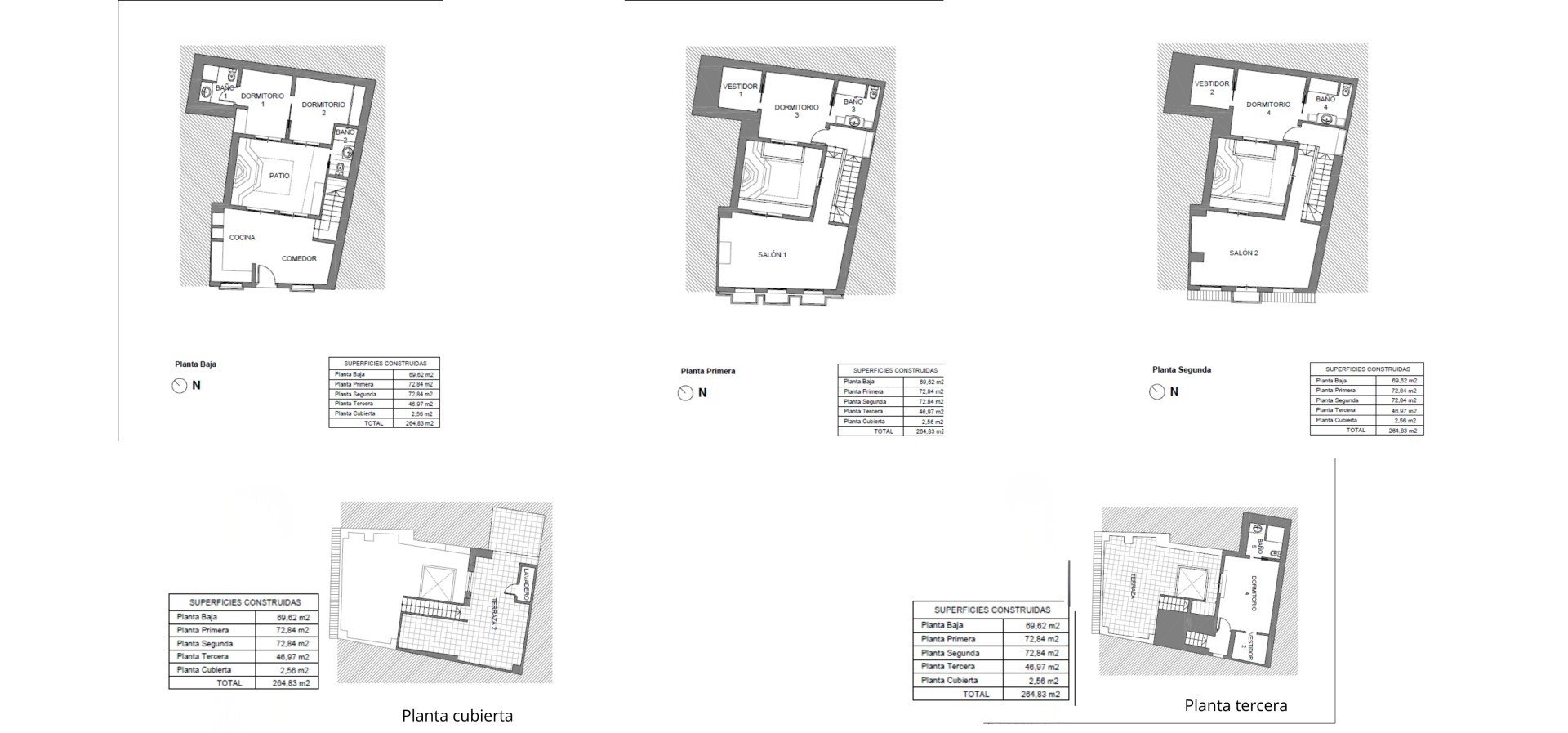 — Distribución: Planta baja + 3 plantas + Terraza
