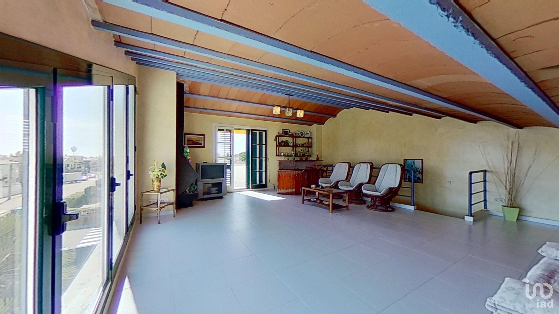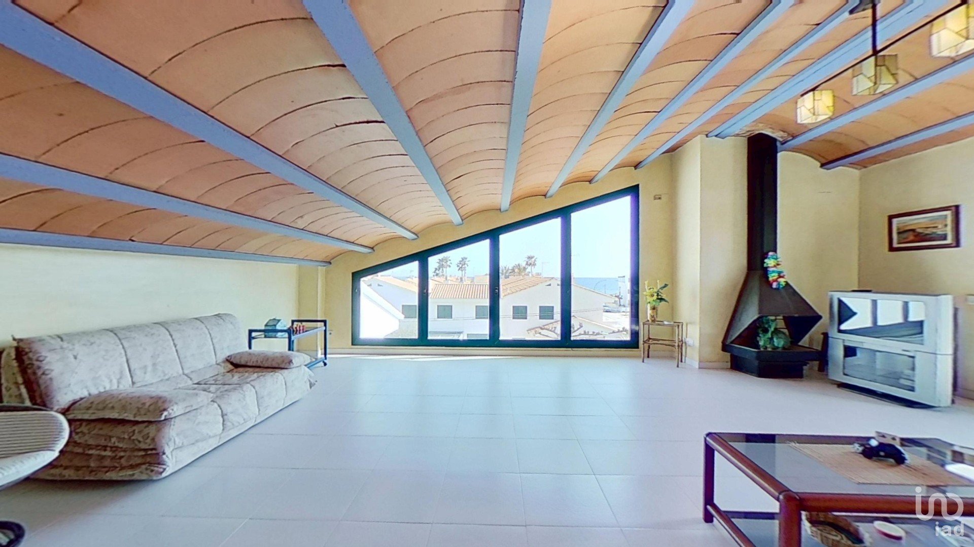 -un gran altillo abuhardillado con chimenea y con impresionantes vistas al mar, un espacio diáfano lleno de luz con acceso a una amplia terraza privada, desde donde se pueden admirar tanto el mar como el encanto de Creixell.