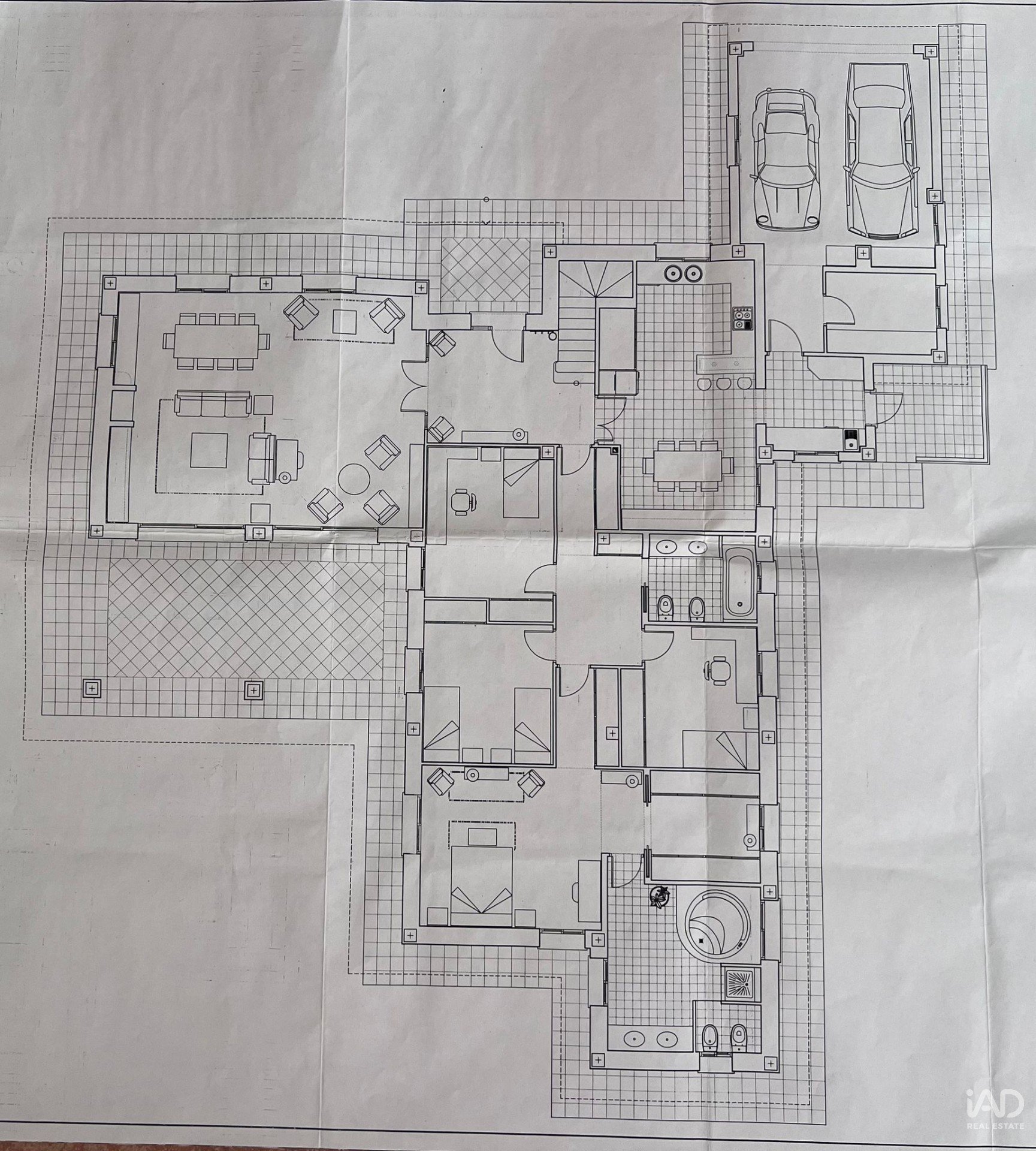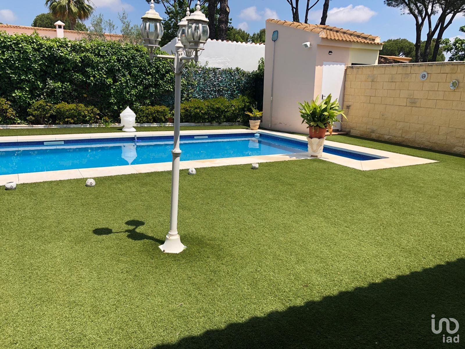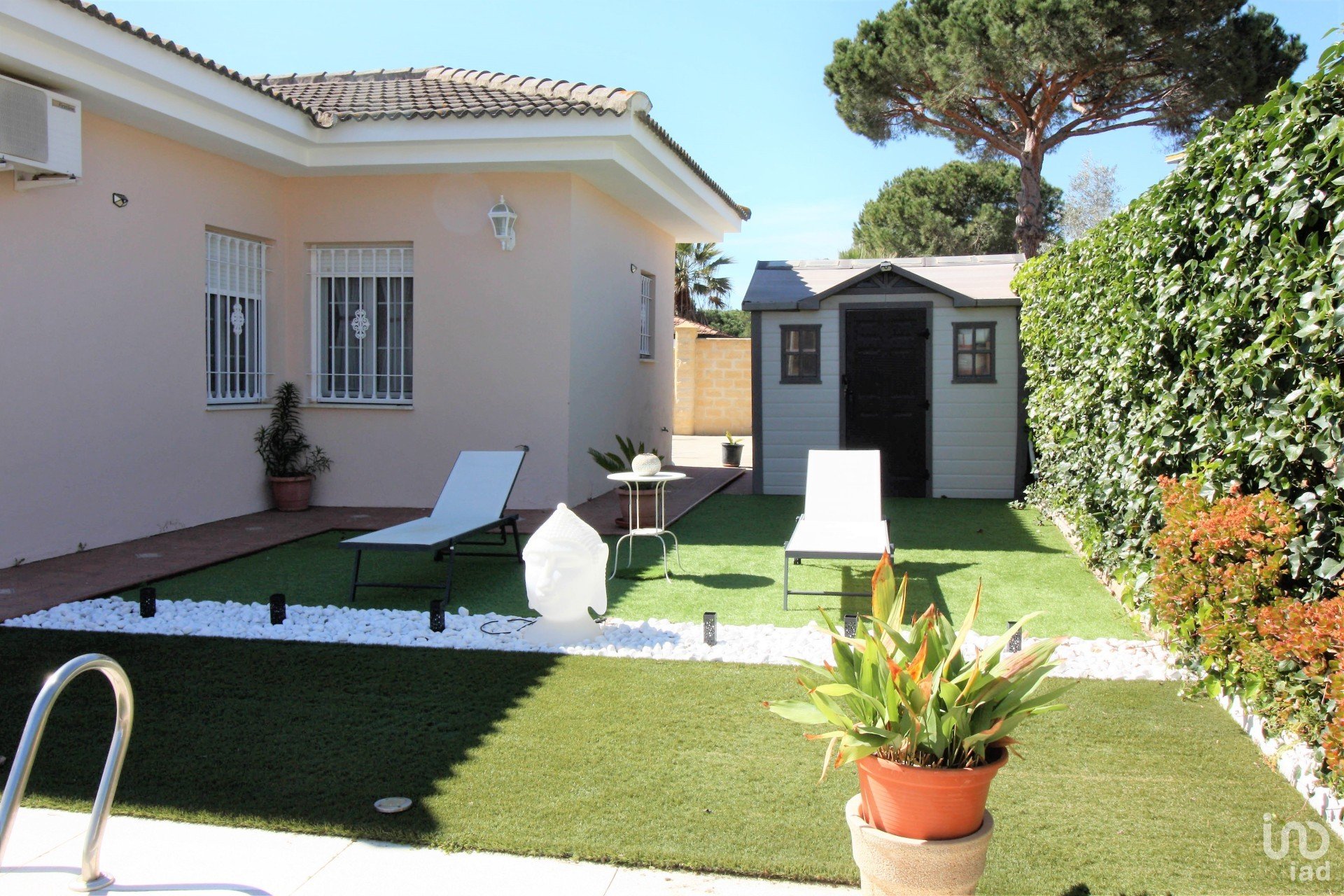 EXTERIOR: la zona de la parcela solada es de gres rústico antideslizante, y el resto ajardinada, con árboles, plantas y césped.
