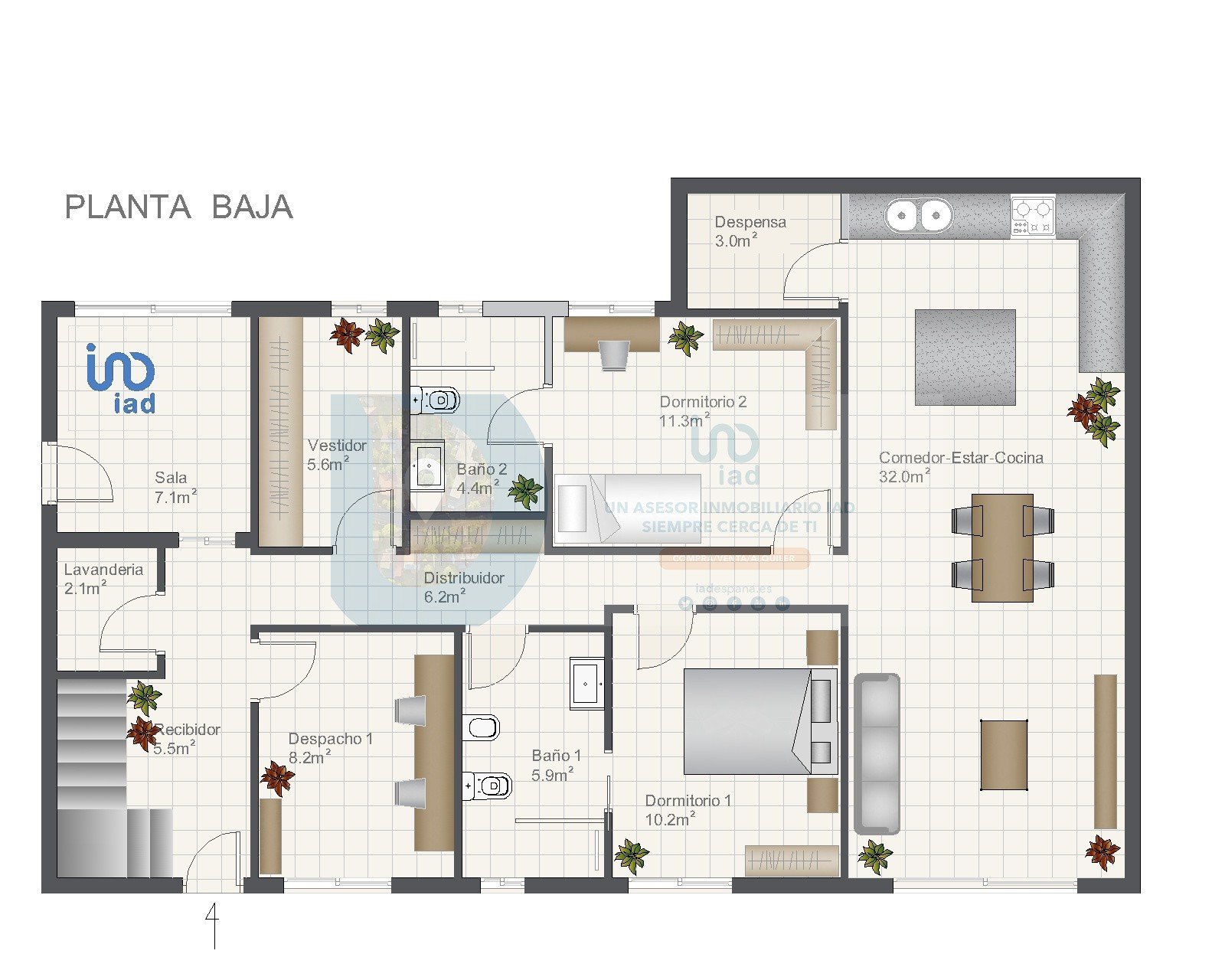 La planta baja es una vivienda diseñada con pasillos amplios y puertas adaptadas, toda exterior con ventanas y pórticos de aluminio blanco en cada una. Incluye dos suites dobles, cada una con su baño completo con ducha y armarios a medida, además de un dormitorio adicional. algo más pequeño, con un armario grande para tener un extra de almacenamiento. El salón-comedor, amplio y práctico, se integra con la cocina abierta y su isla cuadra, ofreciendo un espacio multifuncional ideal para reuniones familiares con una gran mesa rectangular que invita a cualquier celebración además de su sala de estar. Esta vivienda tiene entrada propia desde la puerta principal y no tiene barreras para su acceso.