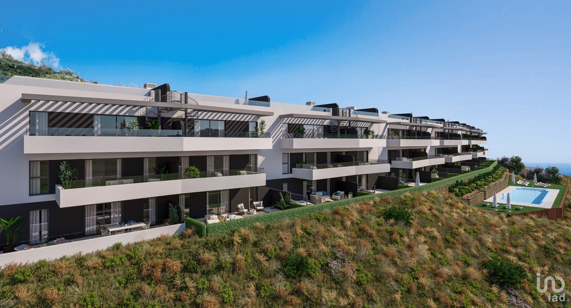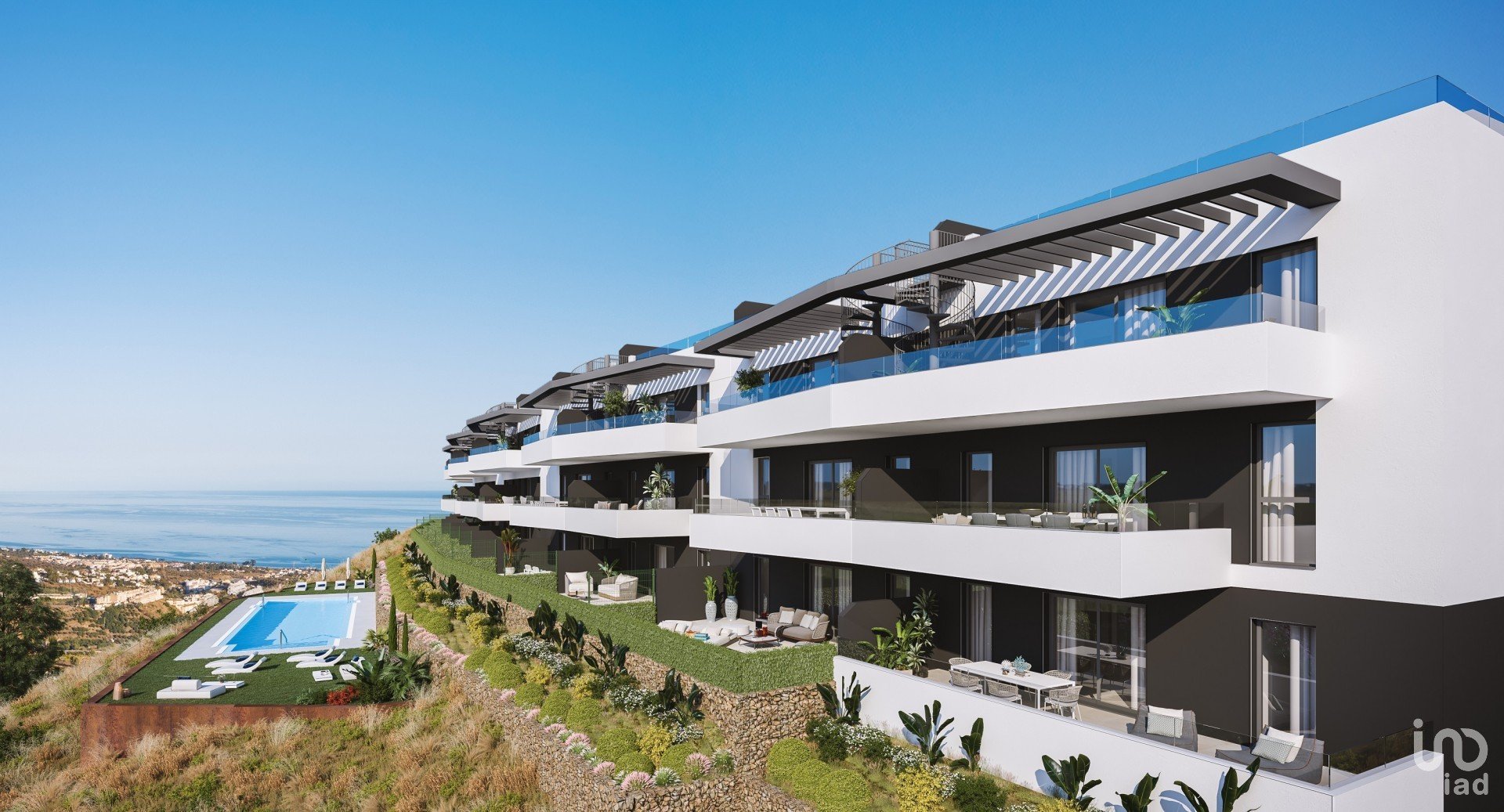 Para aprovechar al máximo su extraordinaria ubicación, hemos contado con los arquitectos Maíz & Díaz, un prestigioso estudio malagueño con gran experiencia y un amplio conocimiento del terreno. Su planteamiento ha sido tan sencillo como efectivo; disponer los edificios de manera lineal sobre el mirador de La Zenaida, donde los edificios y sus amplias terrazas emergen como estratos de la propia montaña. Un risco de formas angulosas en cuya base se extiende una impresionante piscina infinity, desde la que la sensación de ingravidez nos eleva sobre el horizonte.