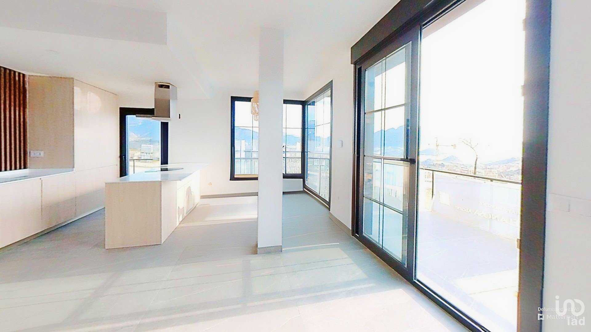 Cocina abierta equipada con mobiliario Porcelanosa, electrodomésticos integrados y encimera de material compacto