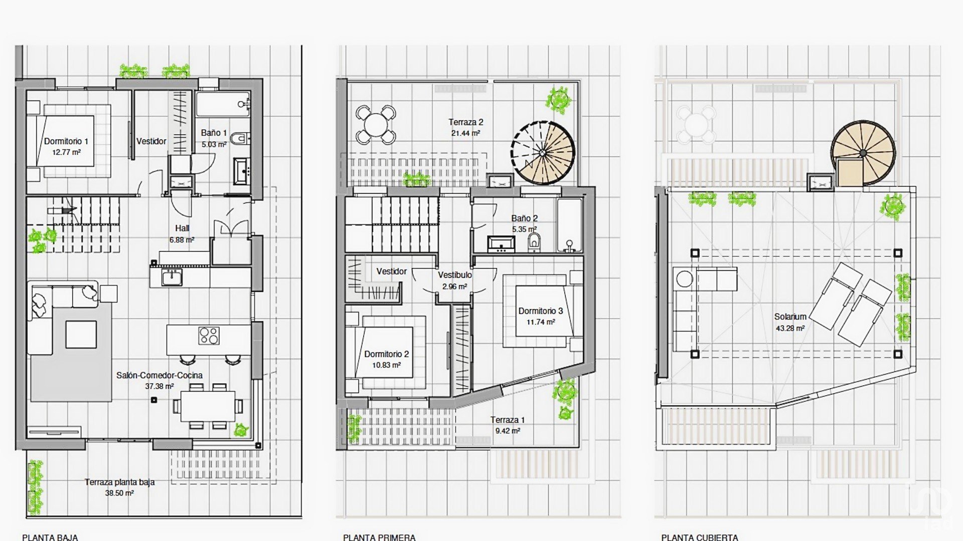 Terrazas: 97,04 m² (repartidas en planta baja, planta alta y solárium)