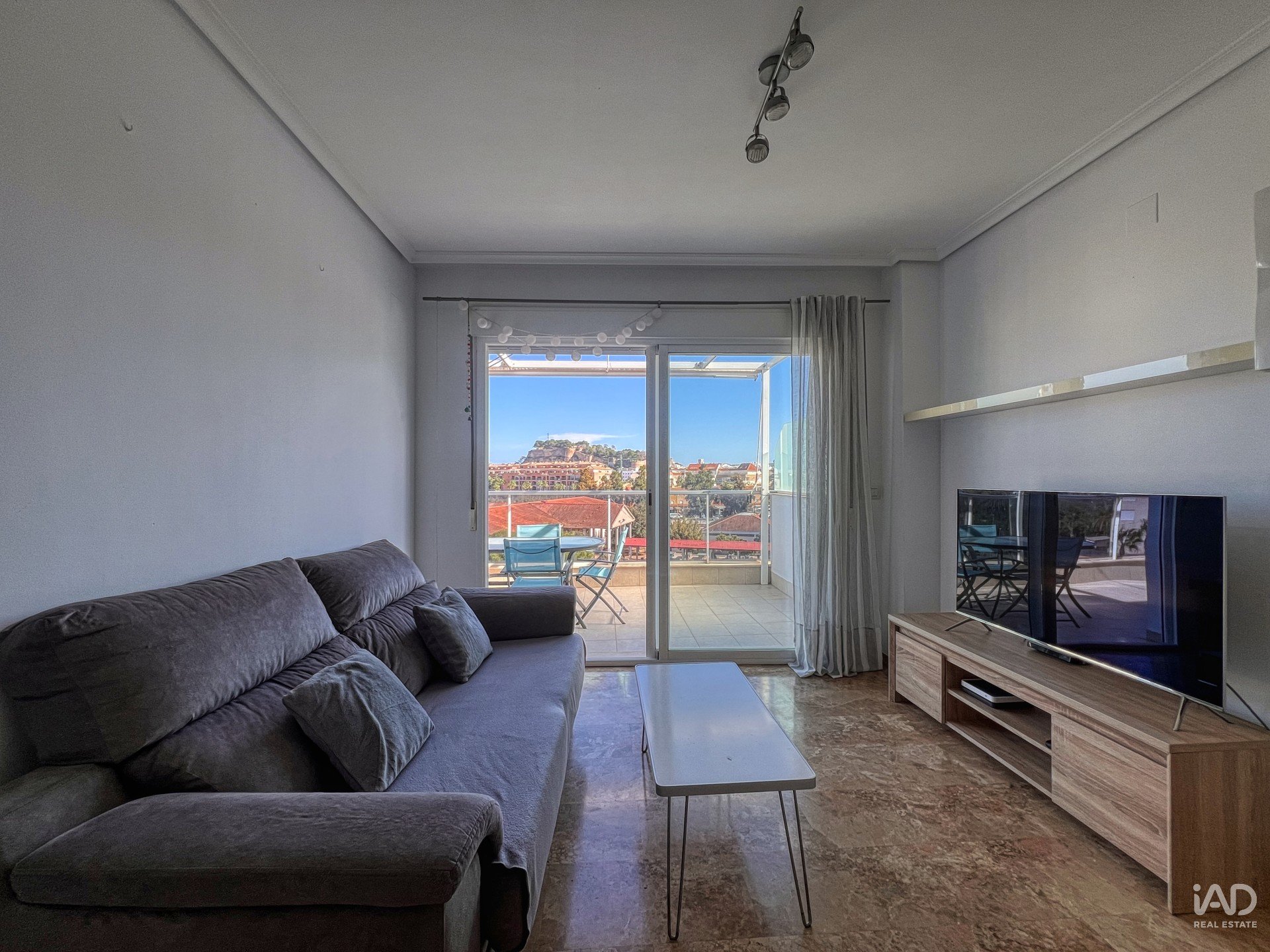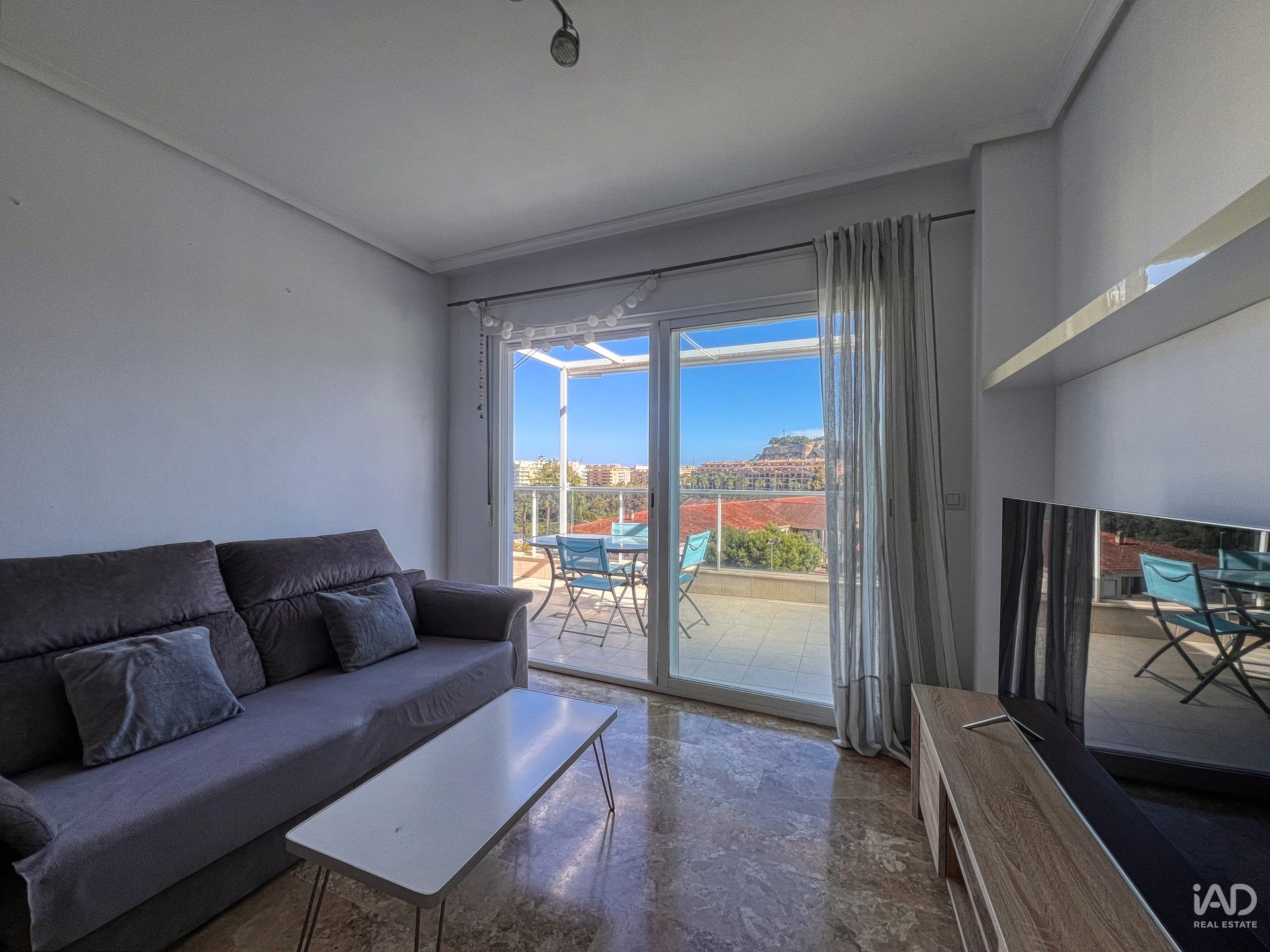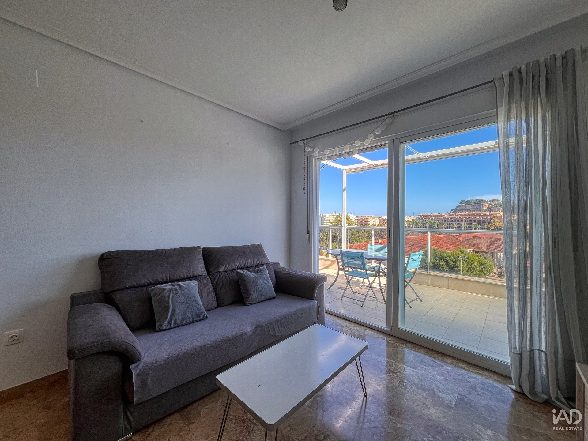 Imagina despertar con la promesa de un sol radiante y el imponente perfil del Montgo acariciando el horizonte, mientras el majestuoso Castillo de Denia vigila silencioso la ciudad. Estas no son postales, son sus vistas cotidianas desde un salón-comedor que, aunque de dimensiones acogedoras, irradia una luminosidad tan intensa y una sensación de bienestar tan profunda que se convierte en el corazón de la casa. Un espacio pequeño, sí, pero diseñado con inteligencia para maximizar cada rayo de sol y cada perspectiva, haciéndolo increíblemente agradable y funcional.