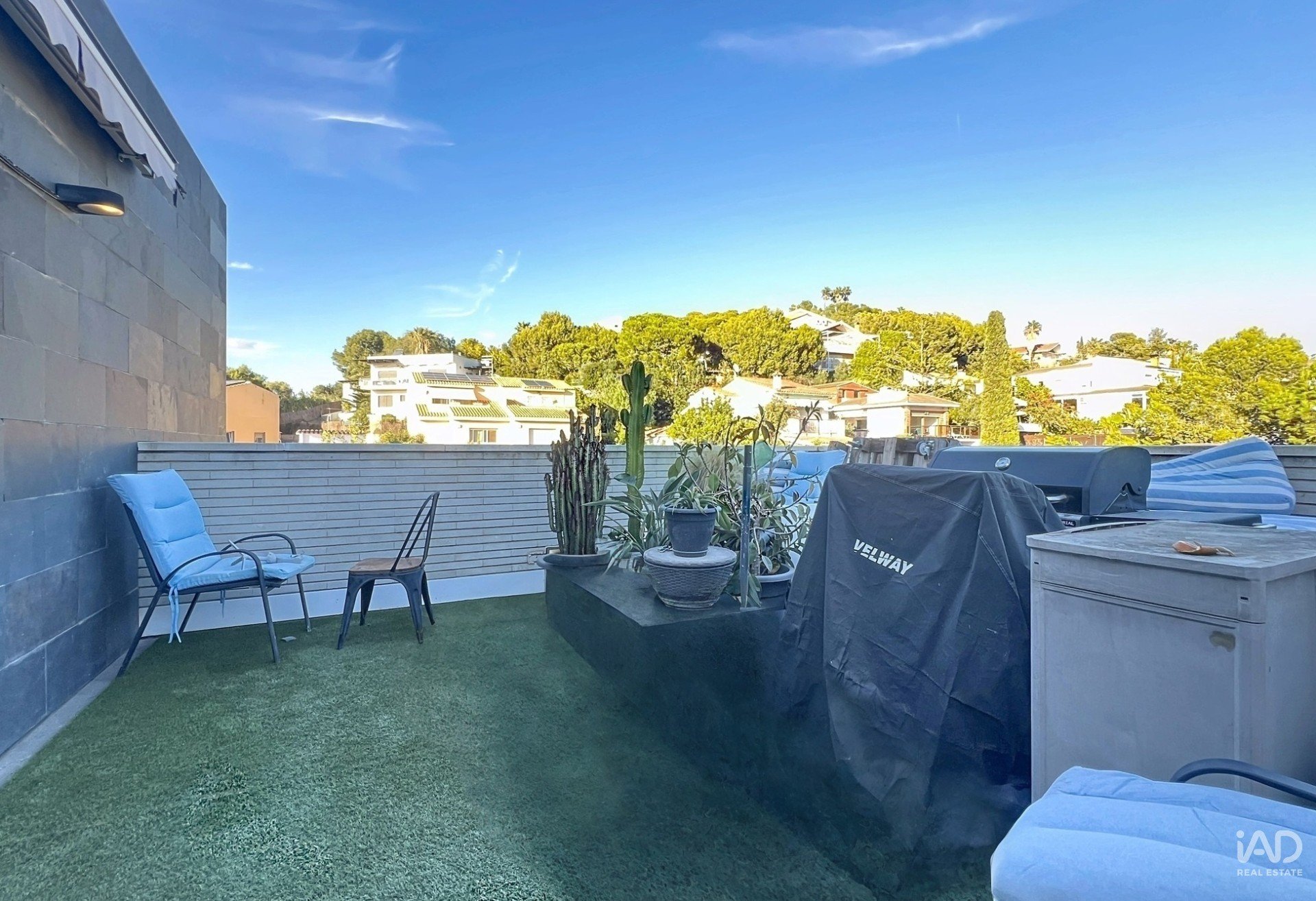 Una escalera central conduce a la planta superior, donde se encuentra un solárium privado. Este impresionante espacio exterior ofrece vistas despejadas a la urbanización de Vallpineda y al entorno natural que la rodea — un lugar perfecto para relajarse, tomar el sol o disfrutar de comidas al aire libre con total privacidad.