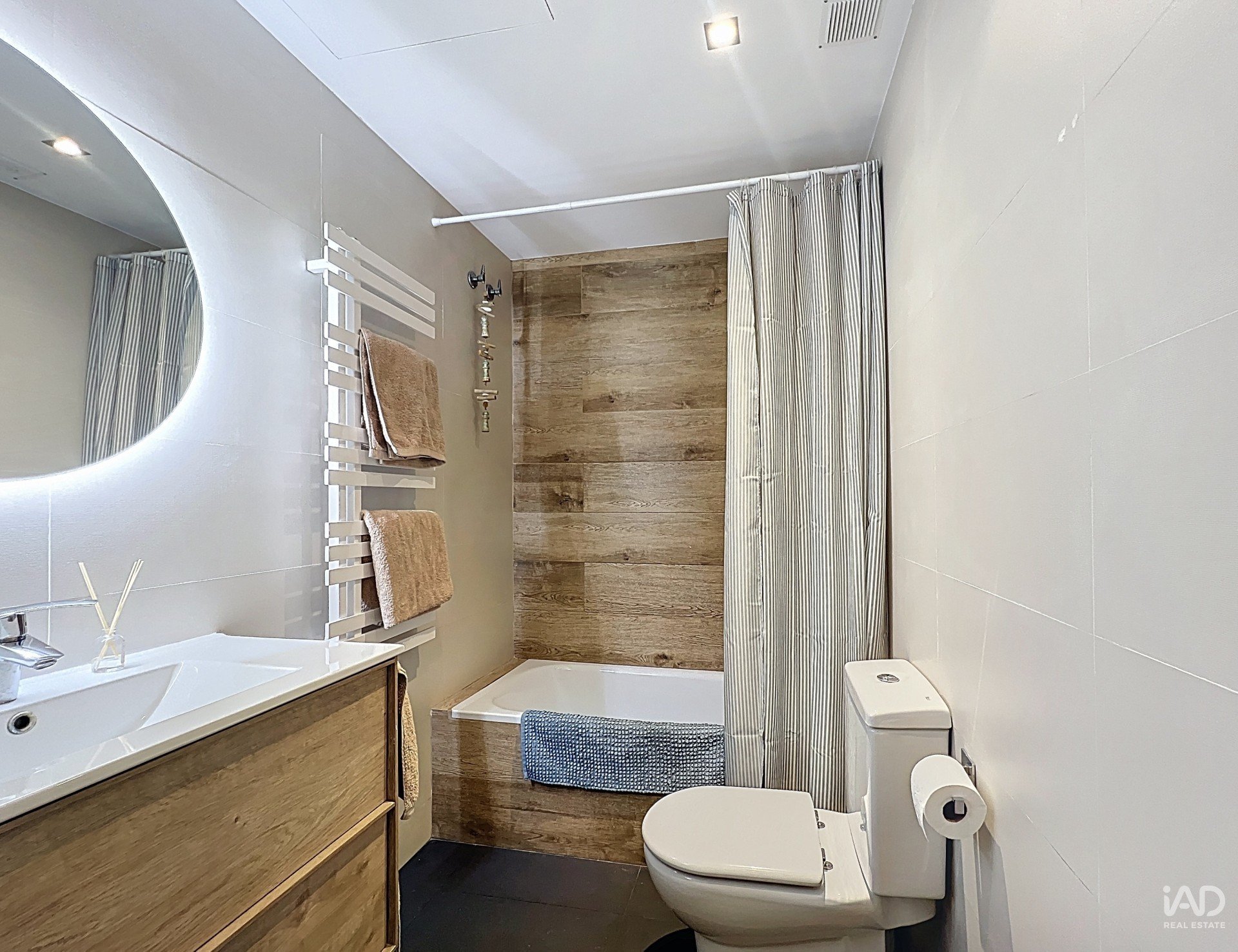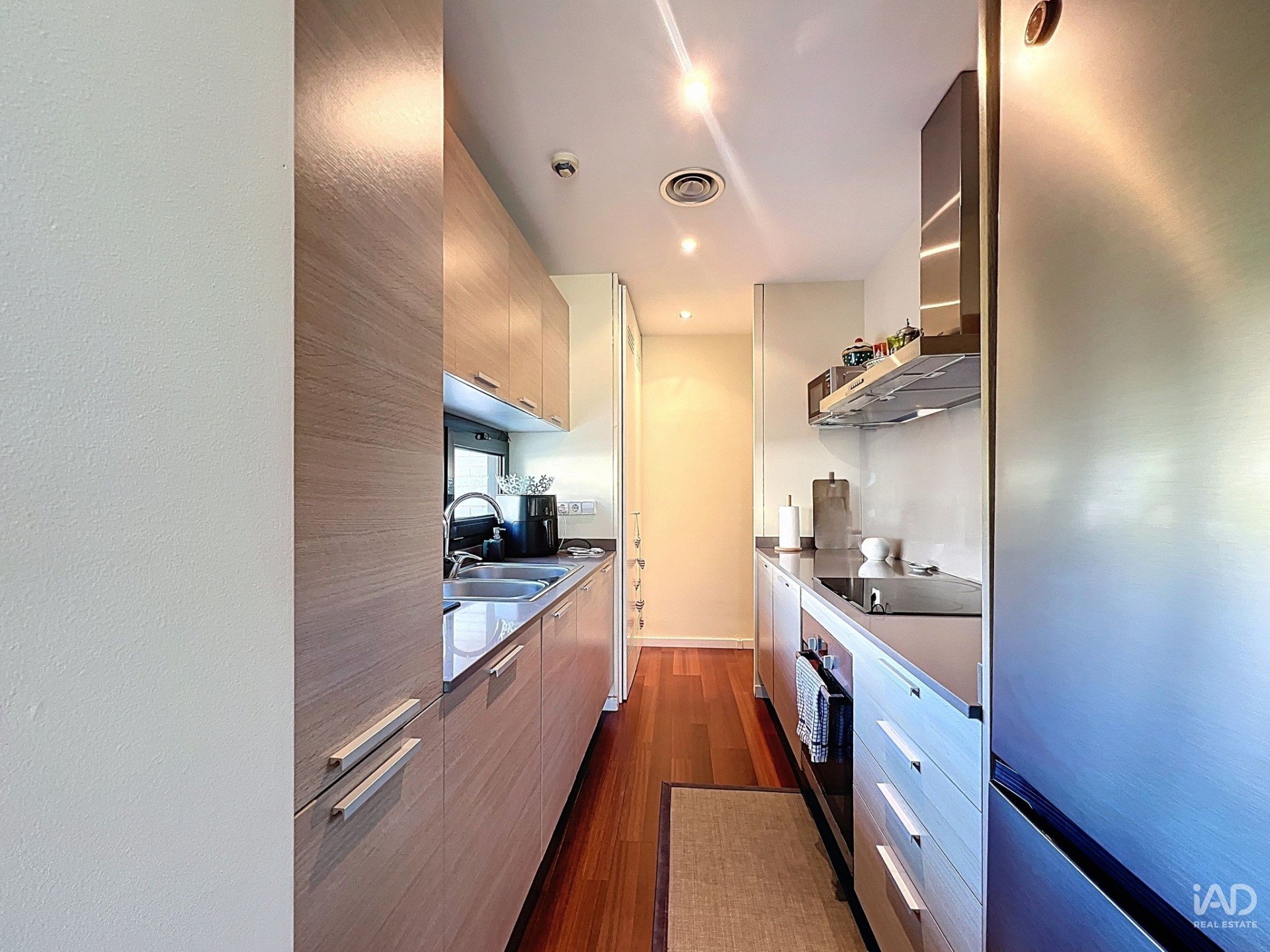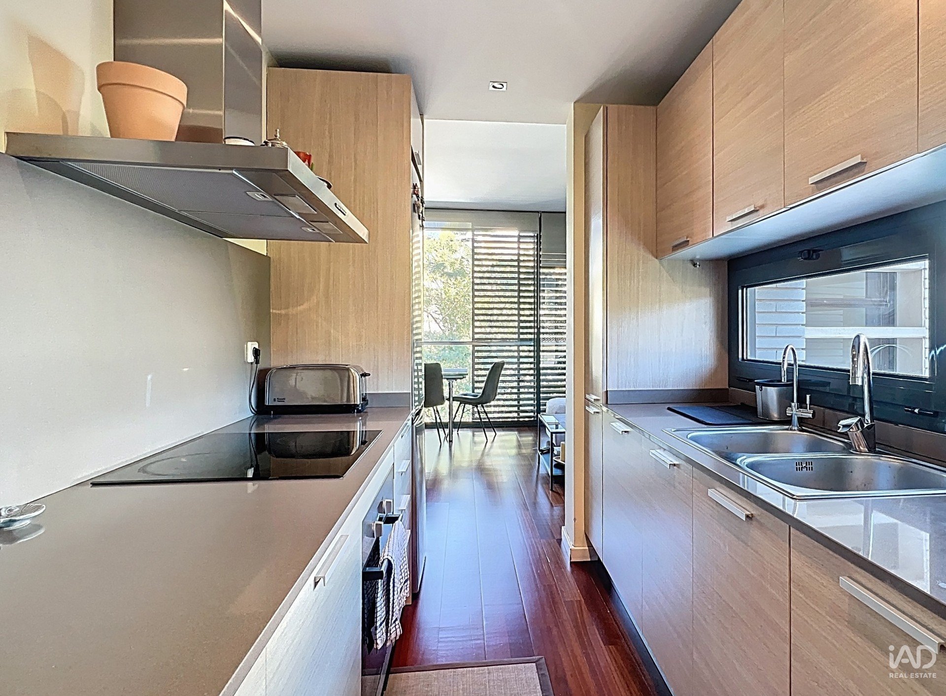 La planta principal dispone de un amplio salón-comedor con grandes ventanales que llenan el espacio de luz natural y se integran perfectamente con una cocina americana totalmente equipada. La zona de noche ofrece dos dormitorios dobles, ambos con armarios empotrados, y un baño completo con bañera.