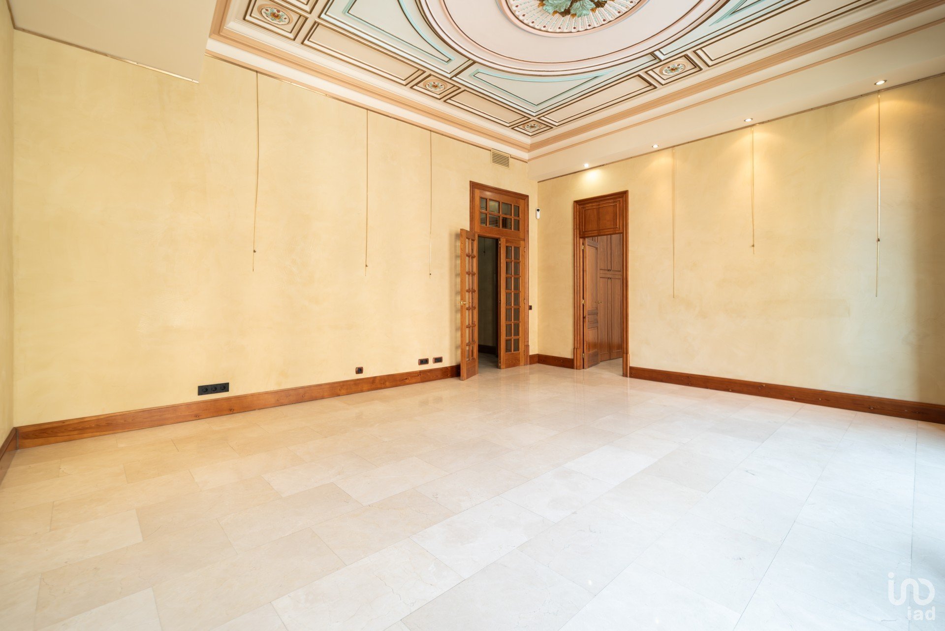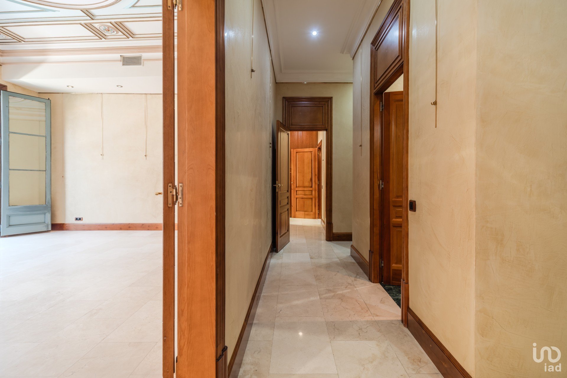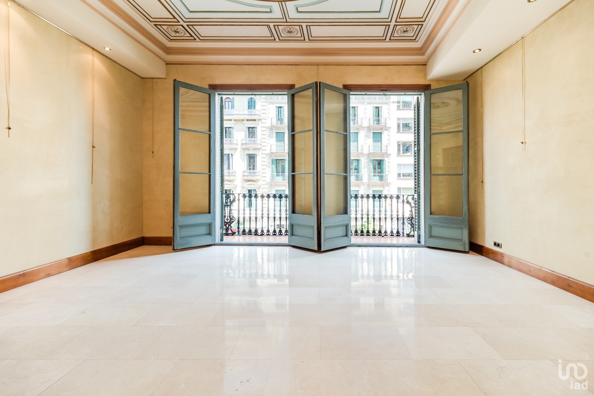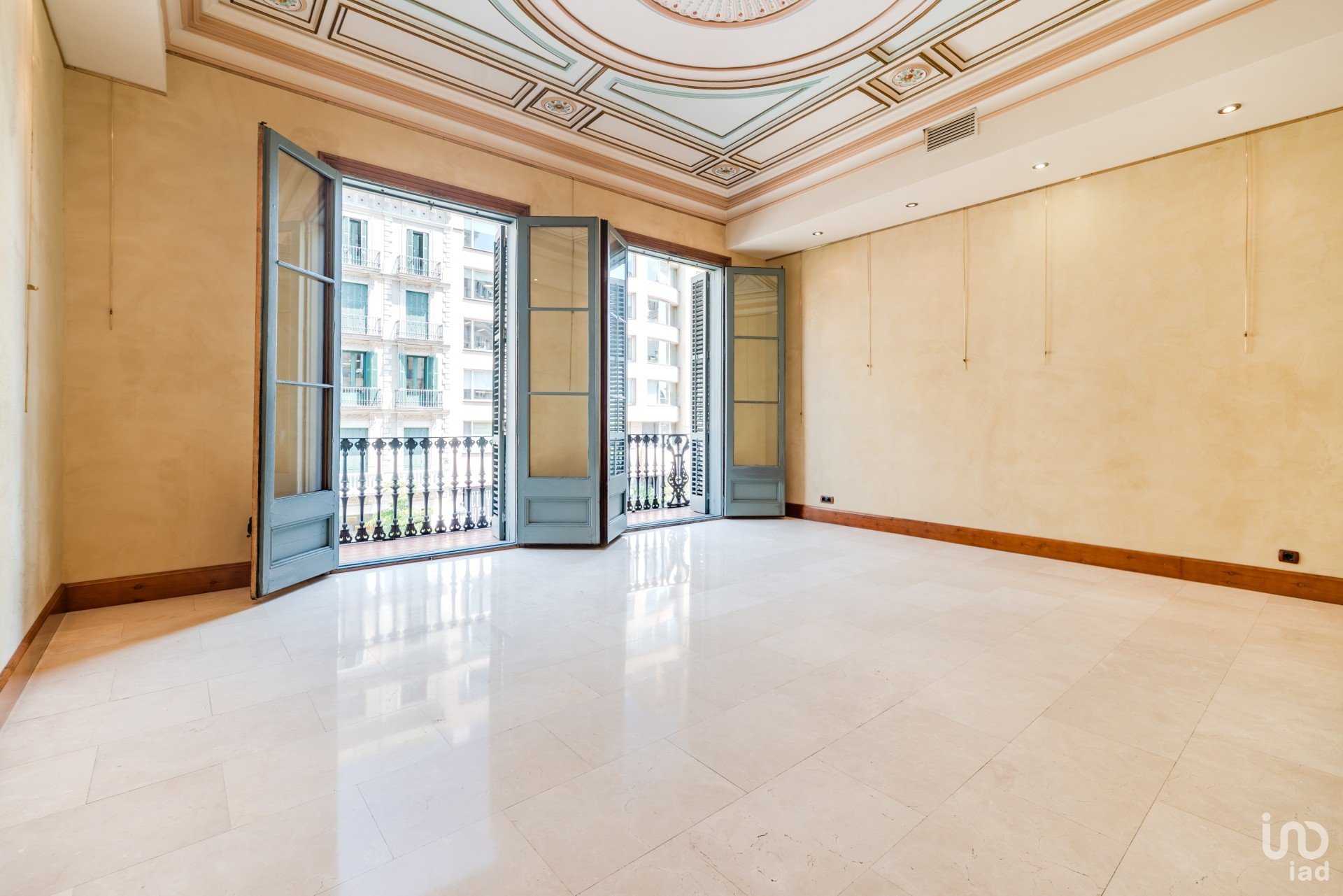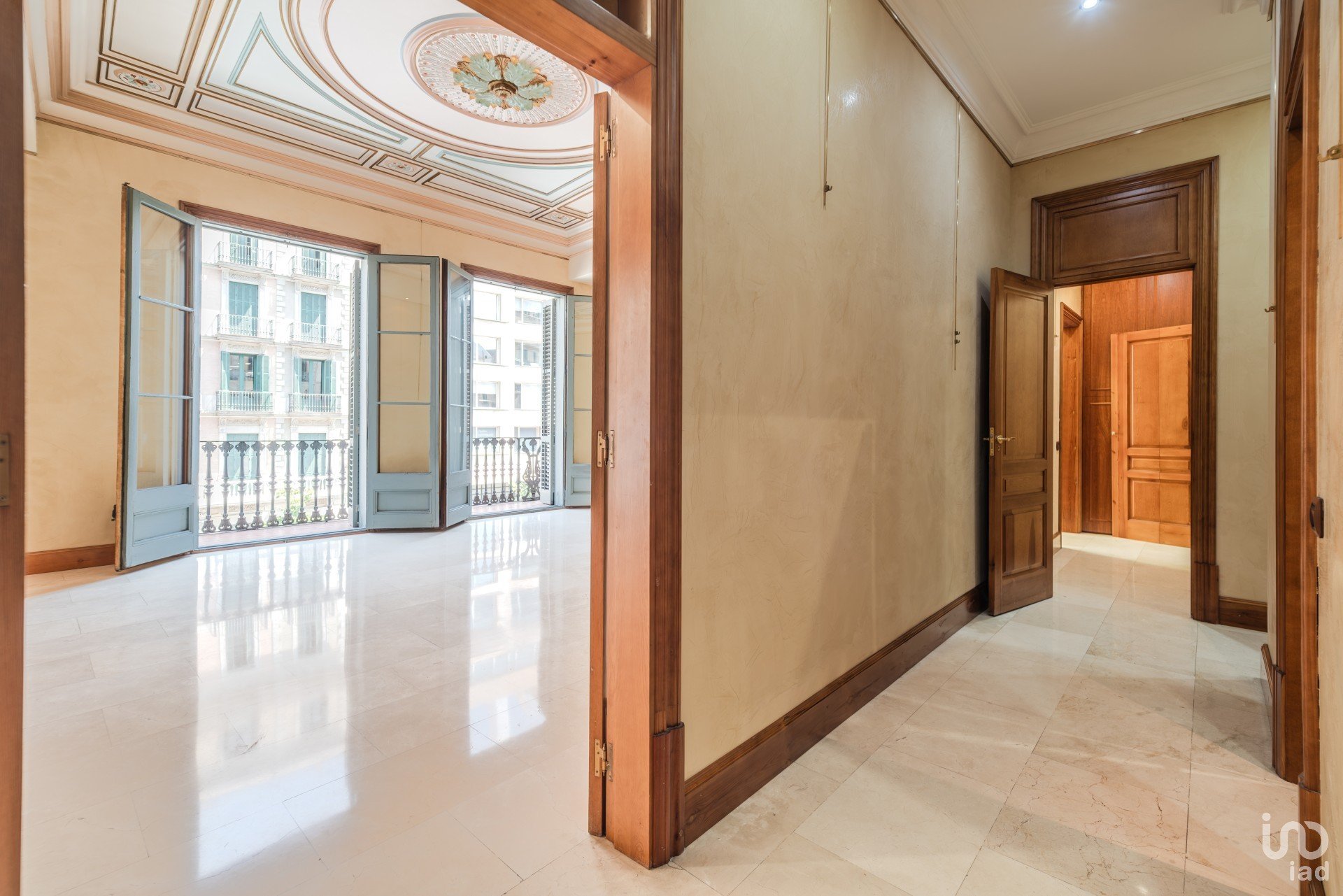 El amplio y luminoso salón principal, con dos balcones orientados a Rambla de Cataluña y Plaza Cataluña, es un espacio señorial donde se han recuperado los techos artesonados originales. Las paredes en estucado veneciano y los suelos de mármol travertino realzan su distinción.