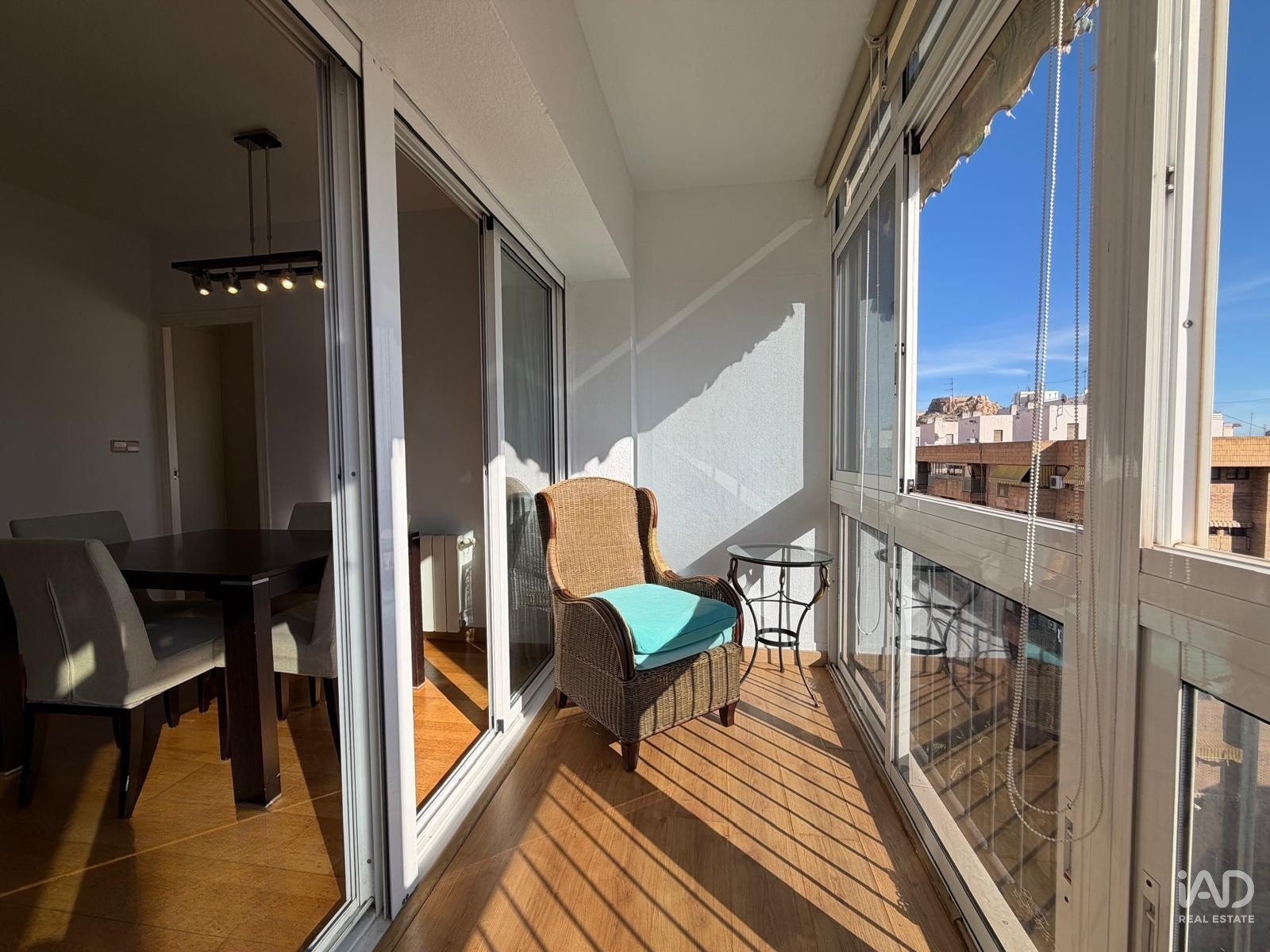 The bright living room, filled with natural light thanks to its excellent orientation, opens onto an elegant glazed terrace from which you can enjoy completely unobstructed views as well as beautiful views of Santa Bárbara Castle. It creates an ideal space to relax, work, or welcome guests in a warm and peaceful environment.
