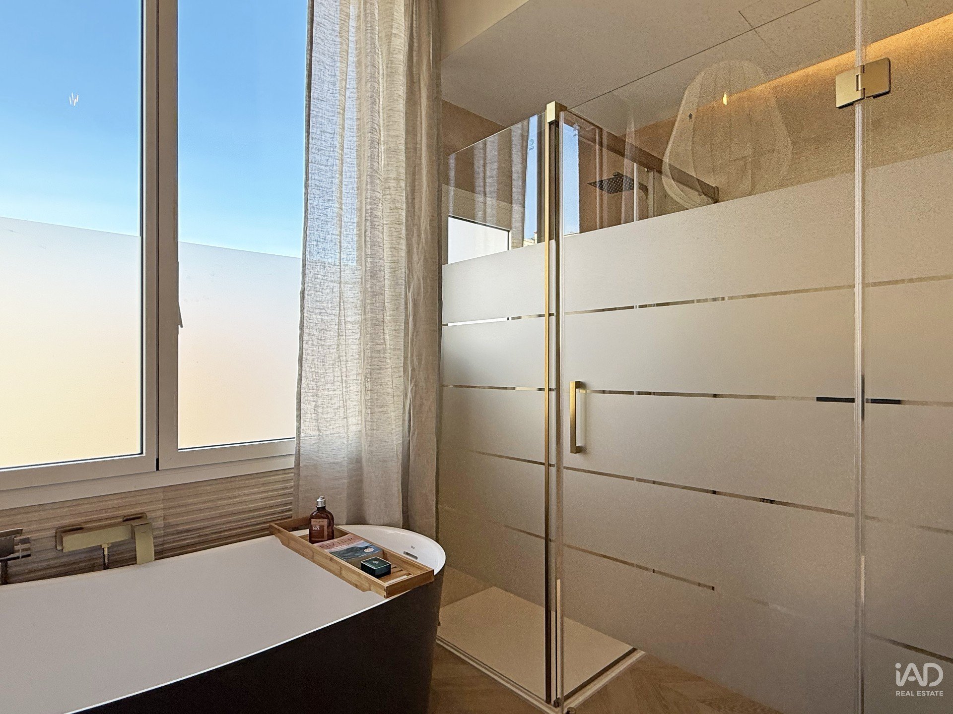 A bathroom designed with premium elements, featuring a freestanding bathtub and a practical walk-in shower.