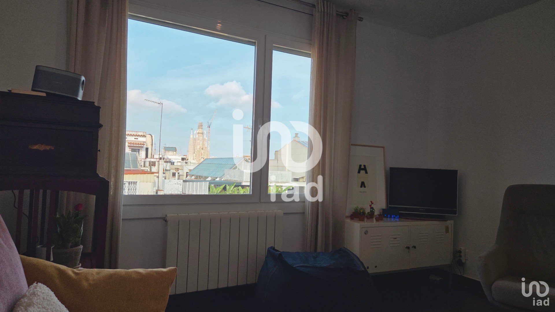 A living area with a street-facing window, clear views of the Sagrada Familia, and access to the terrace.