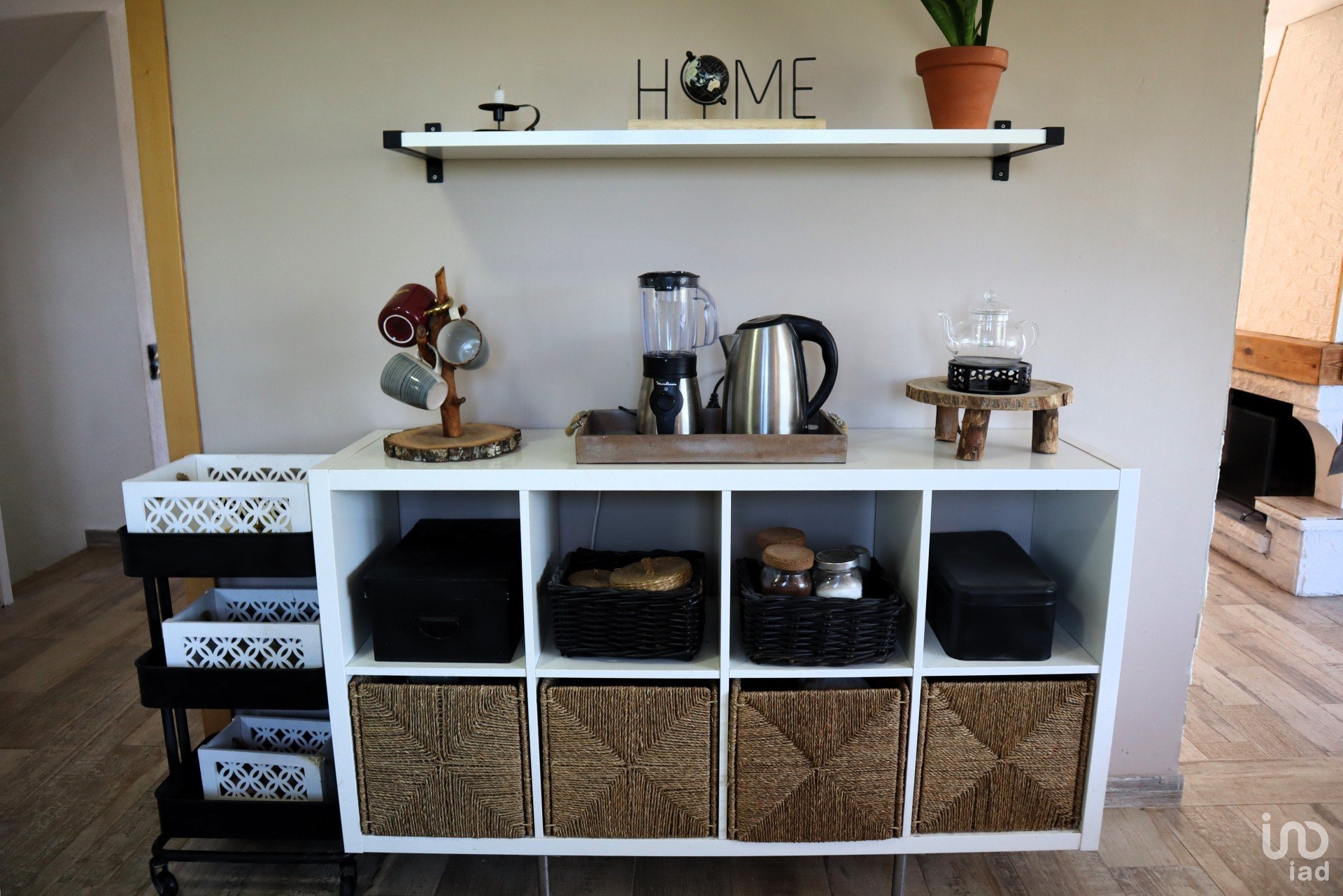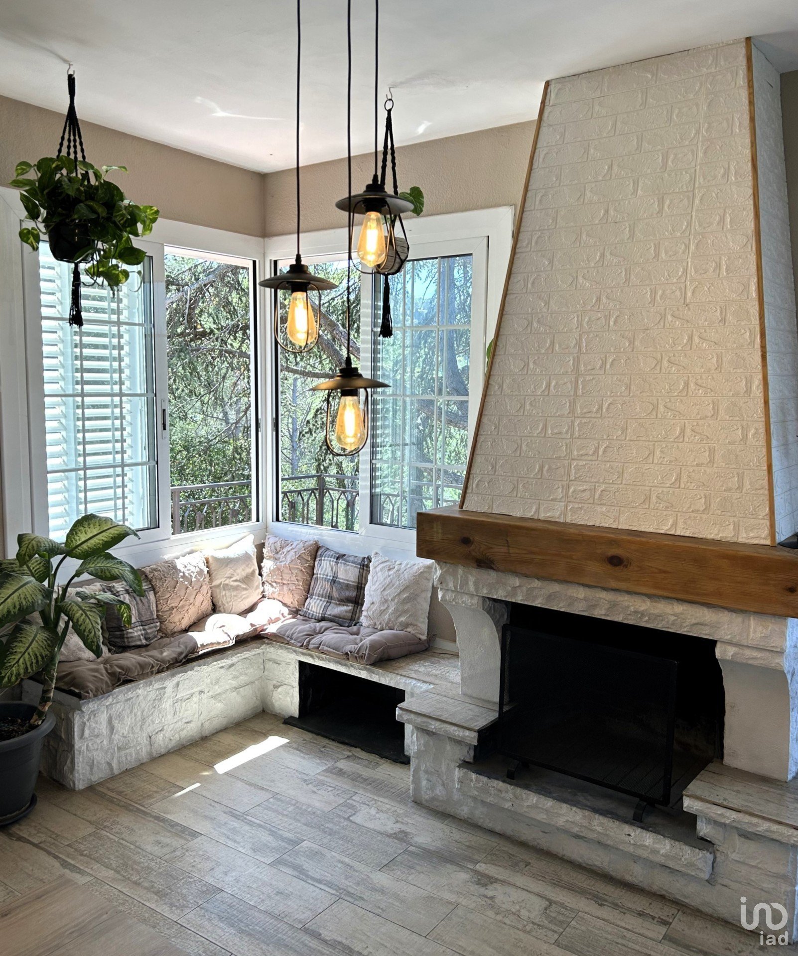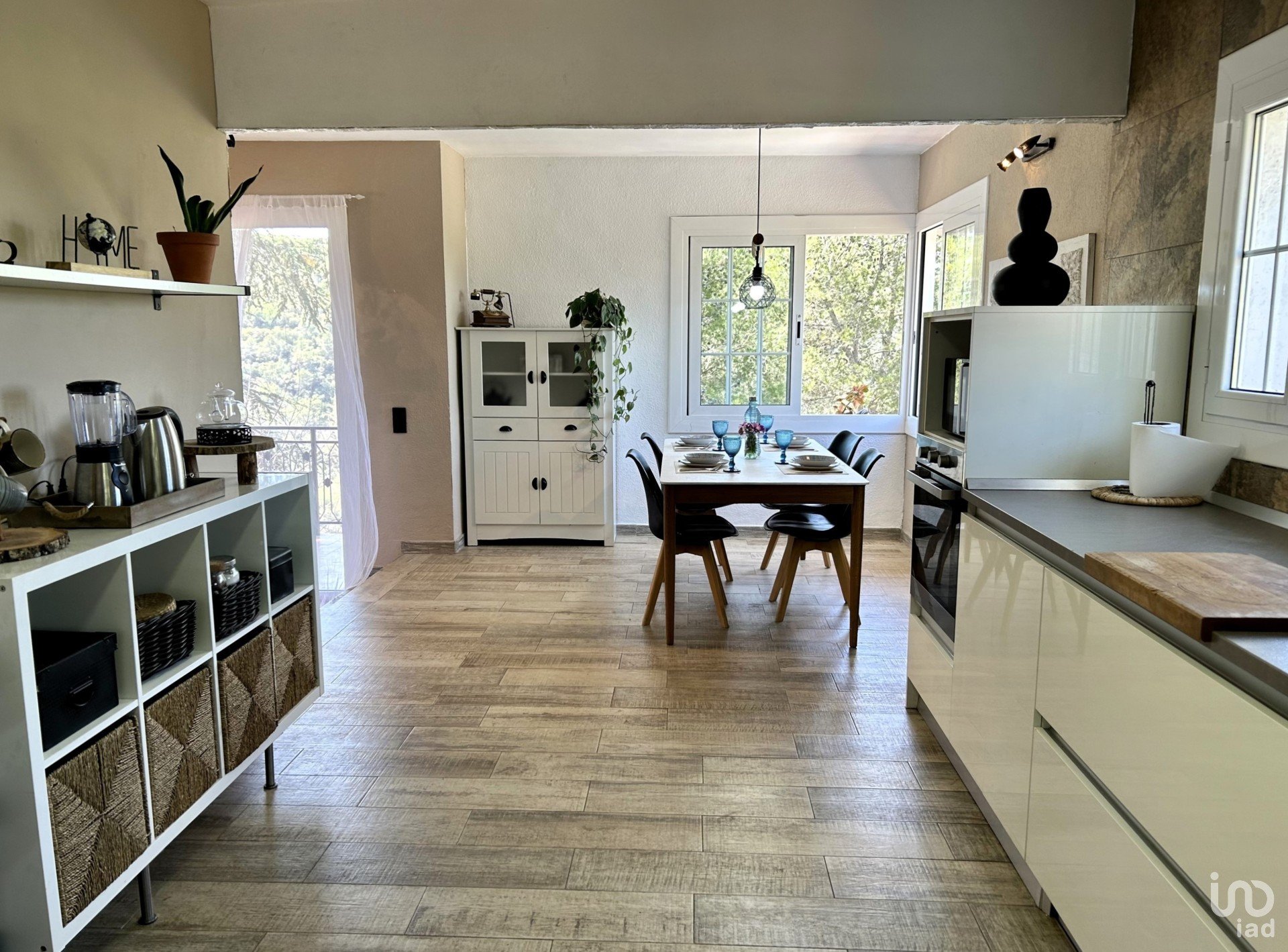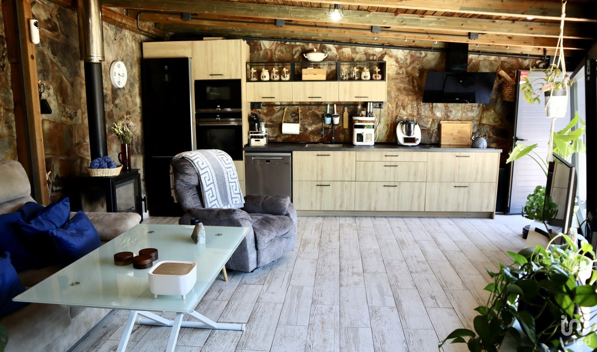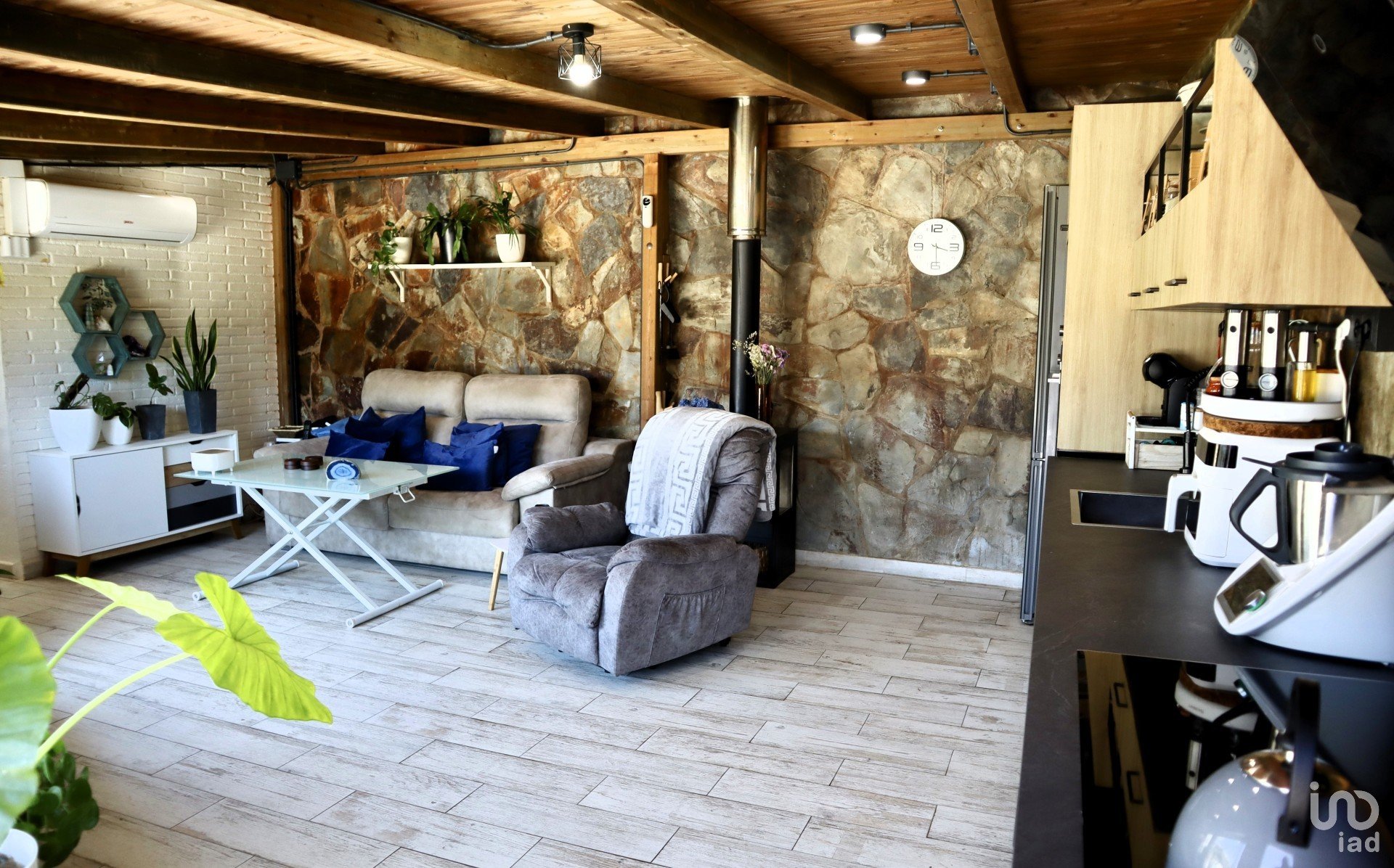 From the garage we can access the day floor of the house, where we have the main door hall with a service toilet and a spectacular kitchen-dining room. Spectacular for its size and the views as seen in the photos. Next, we have the living room with a large fireplace on two floor levels with respect to the kitchen, which makes one area “independent” from another and access to one of the terraces of the house.