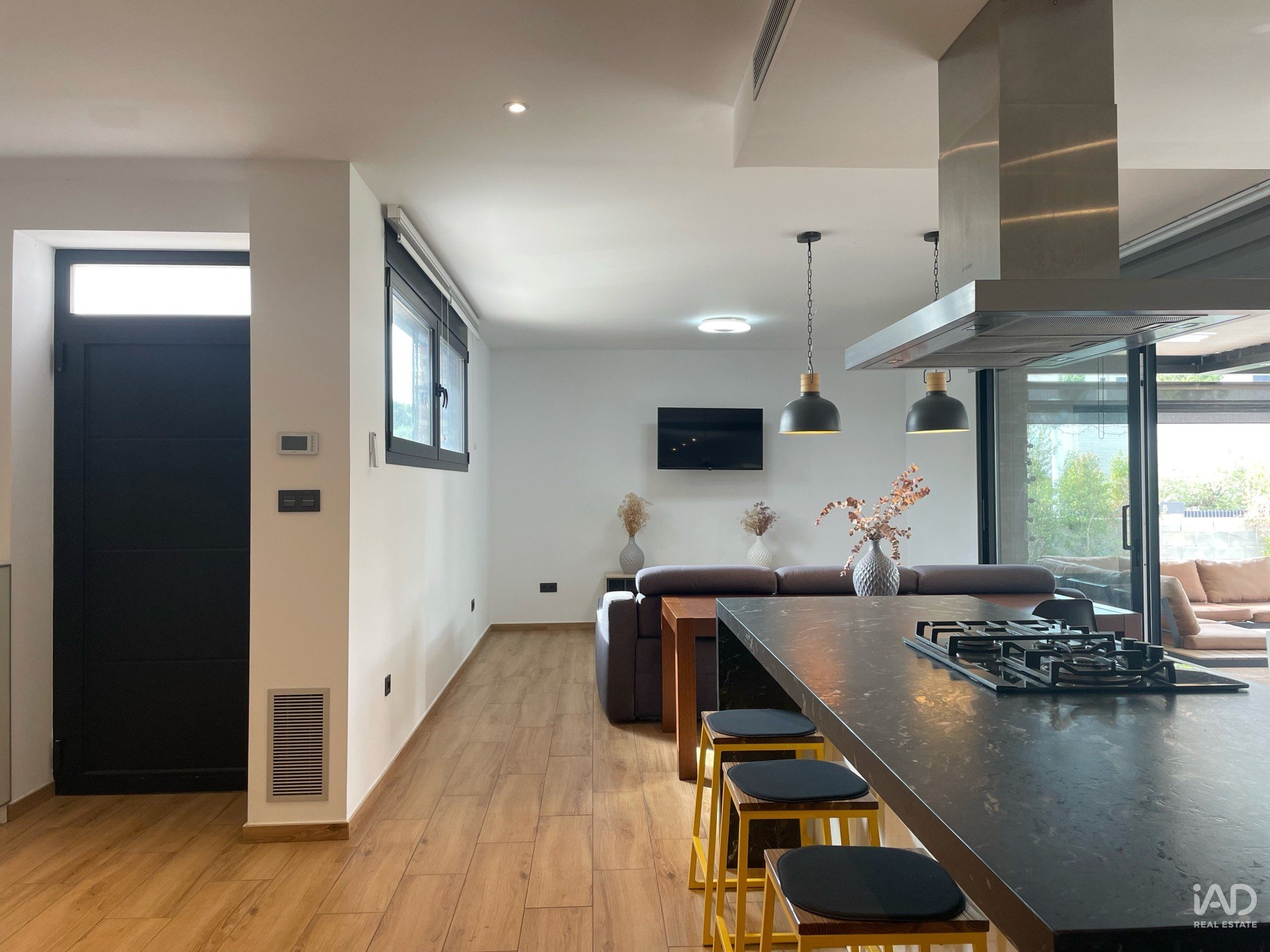 Built in 2016 and distributed over 2 floors, the house features a spacious open-plan area with an American-style kitchen and a living-dining room with direct access to the terrace and garden. On the main floor, you'll also find a garage for 2 vehicles and the sleeping quarters, which include a full bathroom, a single bedroom, two double bedrooms, and a master suite with a large bathroom and walk-in closet.