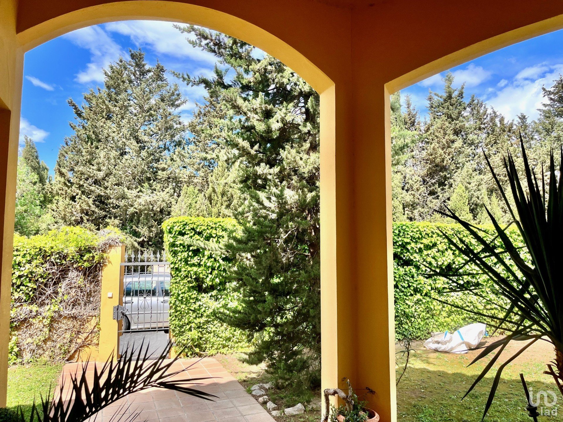 The living-dining room opens onto the semi-covered outdoor terrace, which is covered by various arches that create different spaces next to the garden and the solarium facing the private pool. It faces south.