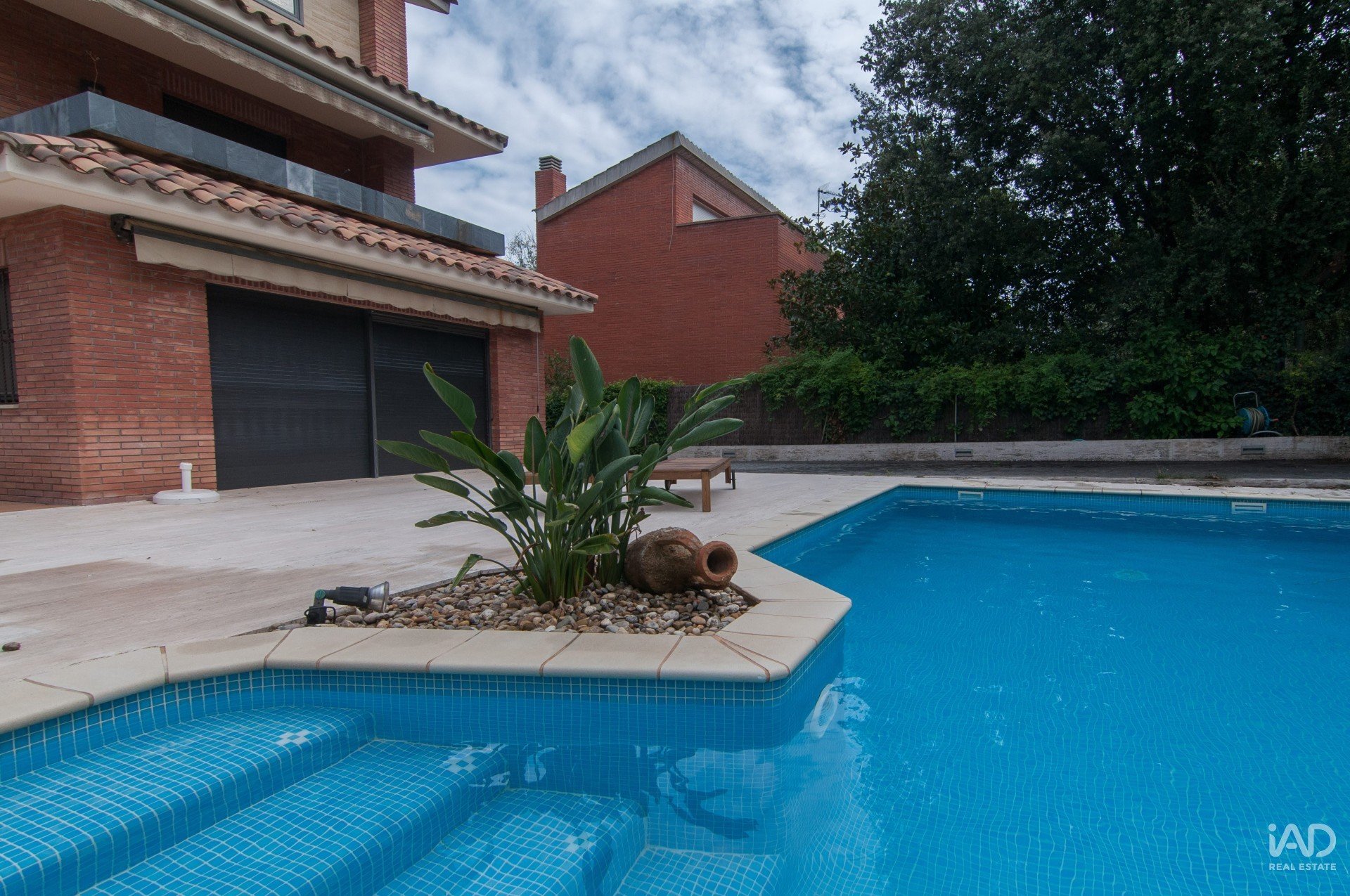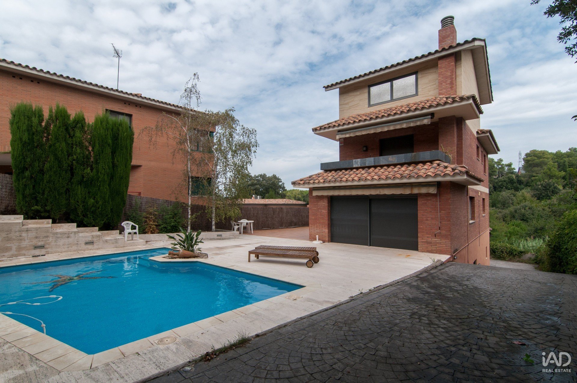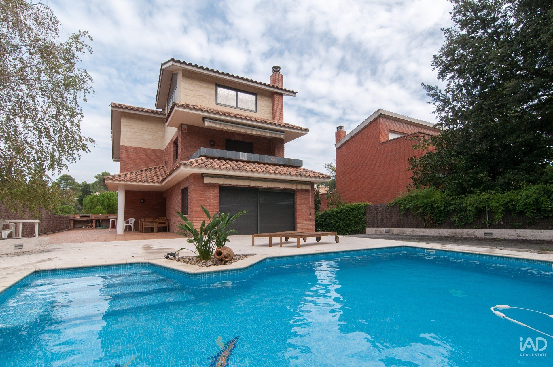 Construite en 2002, la maison dispose de 348 m² construits (280 m² utiles) sur un terrain d’environ 750 m², avec jardin plat, piscine privée, porche, barbecue et parking pour plusieurs véhicules.