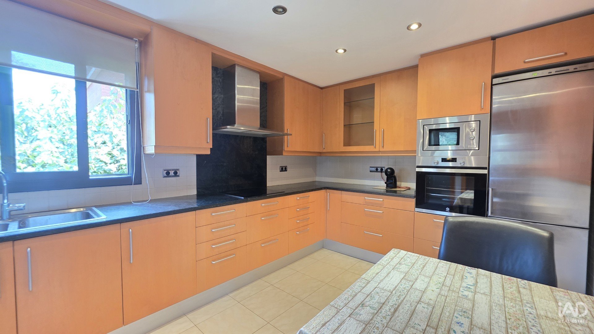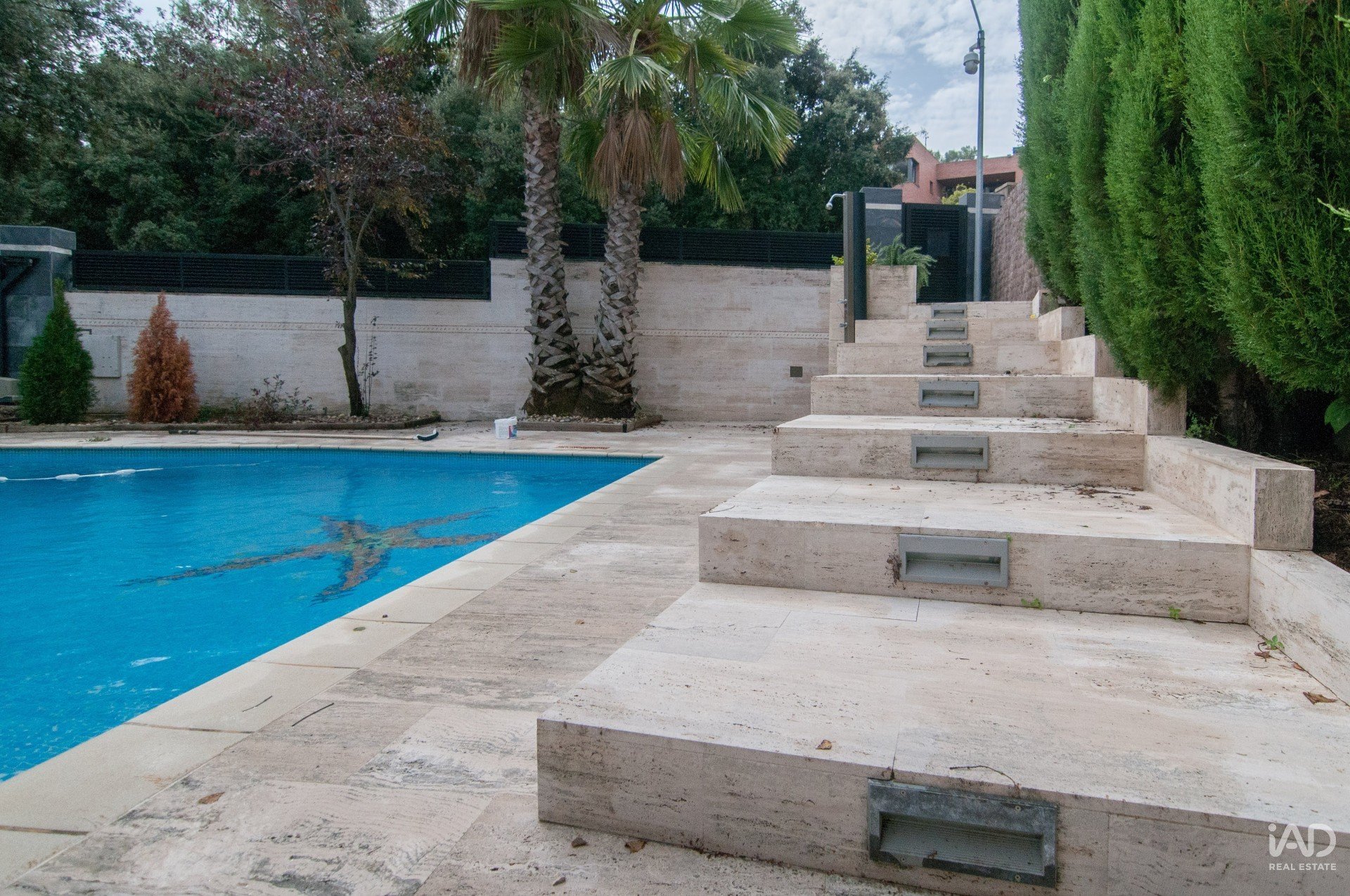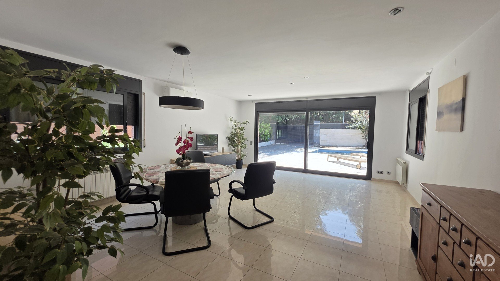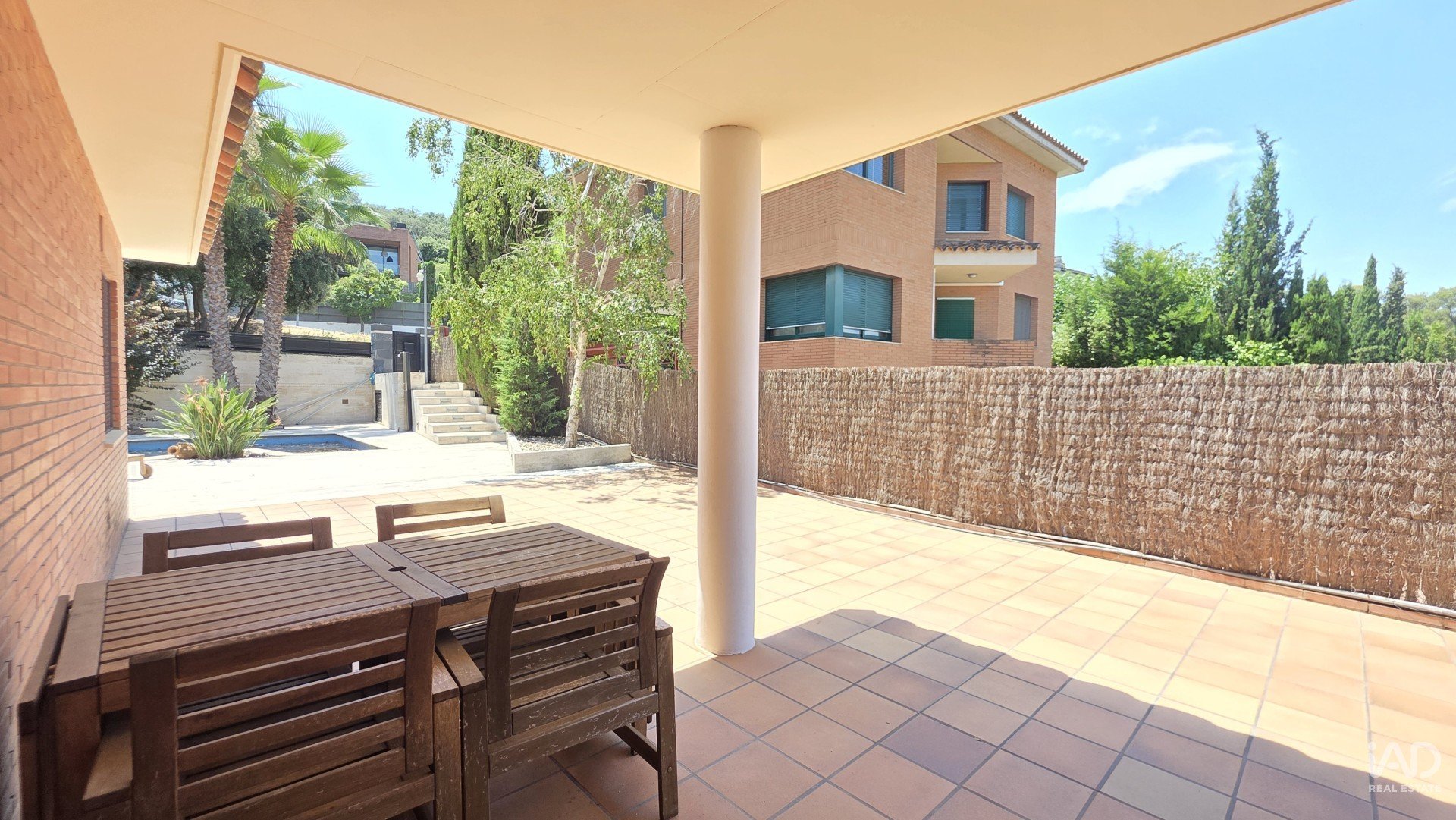 Construite en 2002, la maison dispose de 348 m² construits (280 m² utiles) sur un terrain d’environ 750 m², avec jardin plat, piscine privée, porche, barbecue et parking pour plusieurs véhicules.