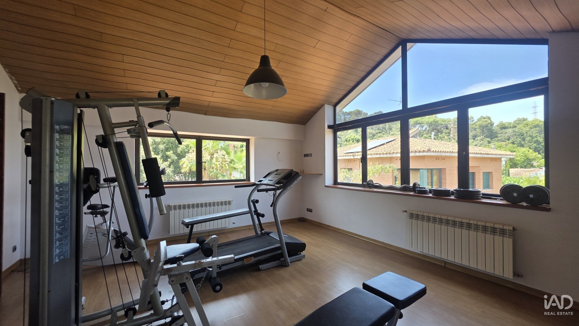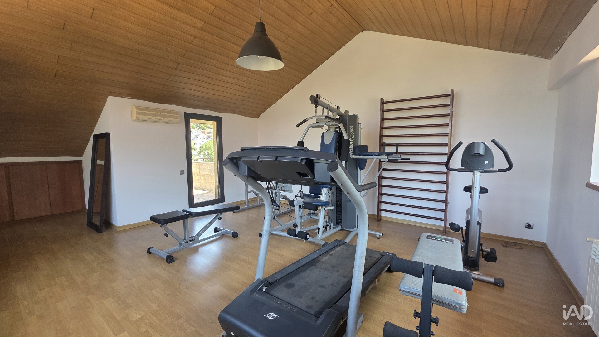 Grande mezzanine aménagée en salle de sport, très lumineuse, avec accès à une terrasse.